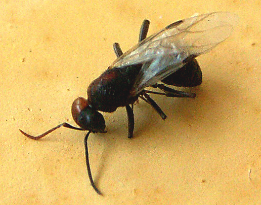 Ich zeige zunächst mal das ganze Tierchen im Überblick. Auffällig ist die linke Antenne, schön „gekniet“ mit langem Schaft, wie sich das für eine Arbeiterin gehört, und die rechte Antenne, mit ganz kurzem Schaft und ellenlanger Geißel, die an Schlupfwespen erinnert.