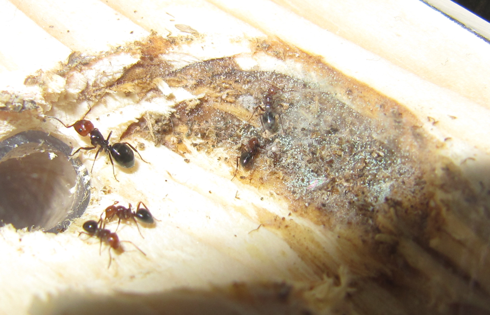 Der erwähnte Schimmel wurde von den Ameisen sofort entdeckt und die kleinen Holzbewohner machten sich erfreulicherweise sofort daran ihn zu entfernen:
