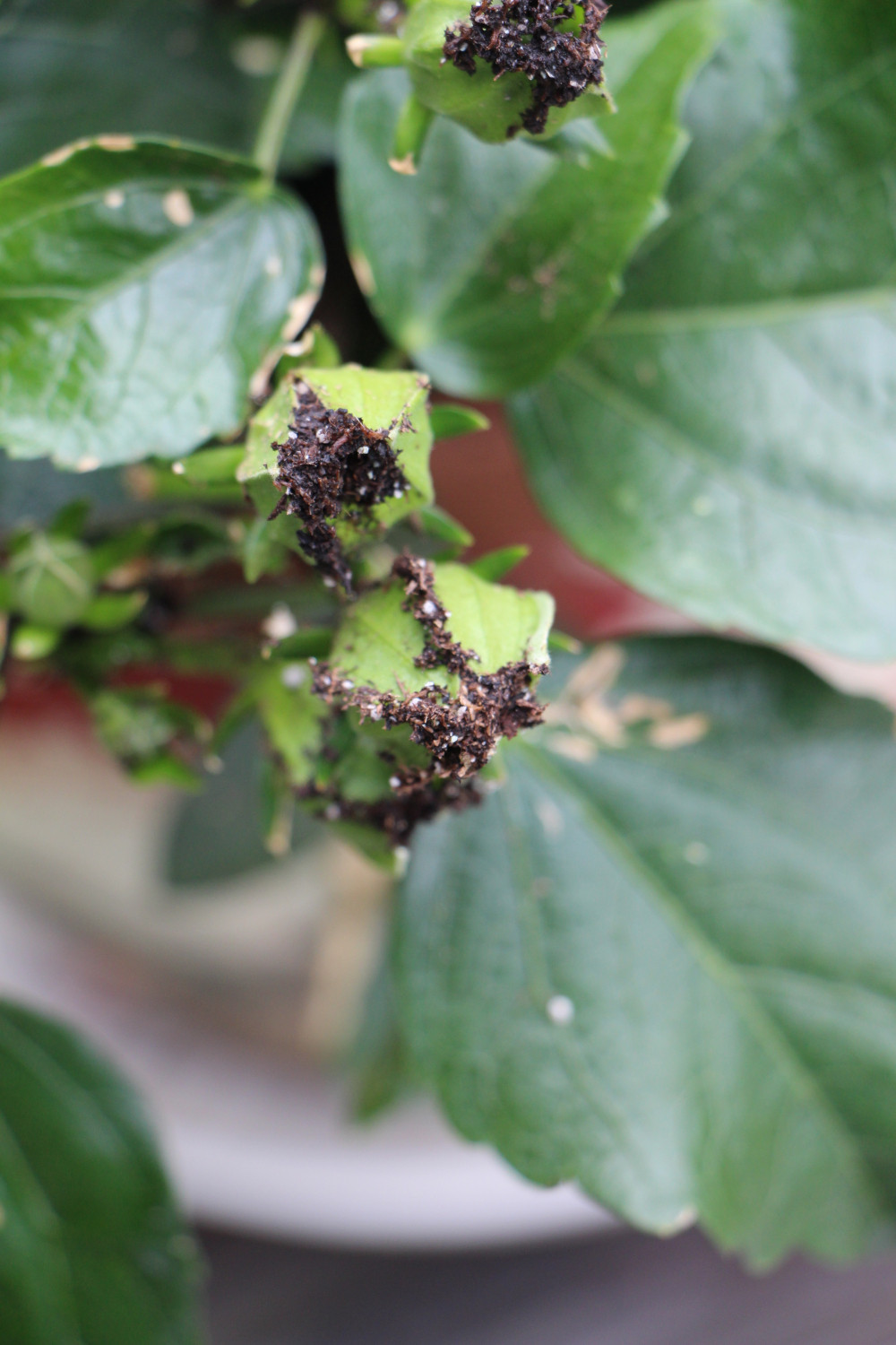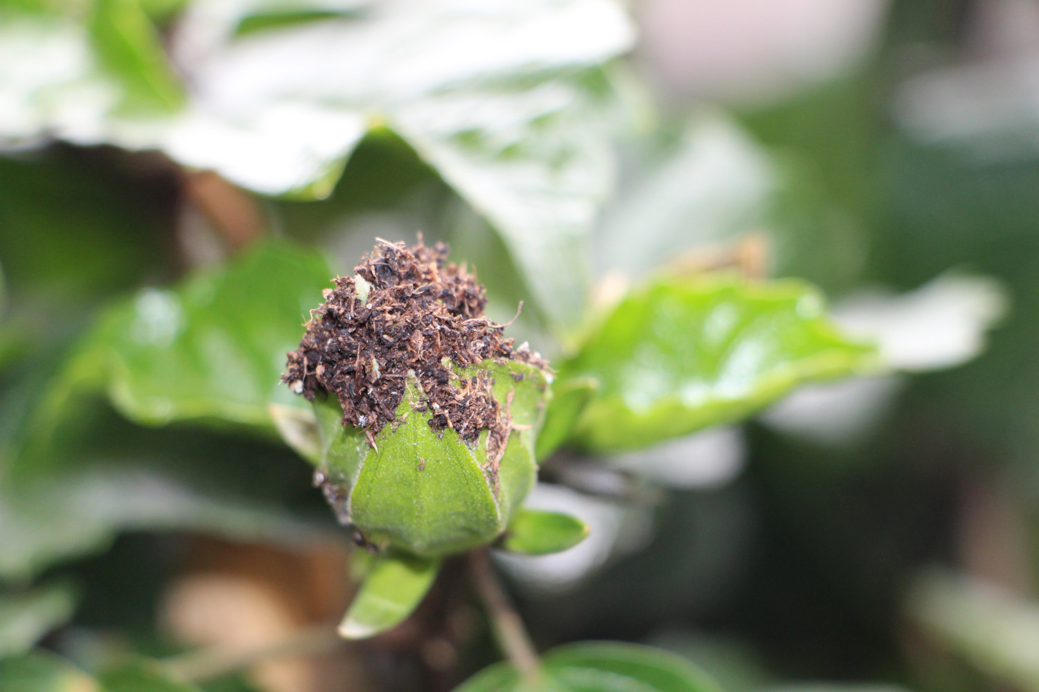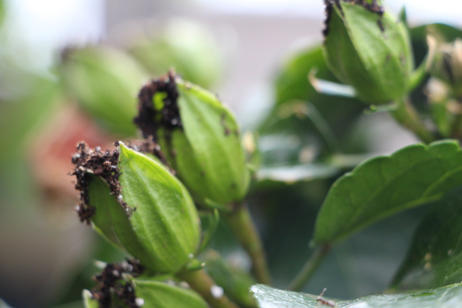 Dass Ameisen gerne Blattläuse hegen und pflegen, um an deren deliziöse Ausscheidungen zu kommen, konnte ich bereits beobachten. Auf der vor wenigen Wochen erworbenen Hibiskuspflanze nimmt dies jedoch, zumindest für mich, recht ungewöhnliche Ausmaße an. Statt sich, an der Pflanze herauf und herunter laufend, lediglich auf das Melken der Läuse zu beschränken, verbauen die Ameisen nun die Blüten bzw. das, was nach der Blüte davon übrig bleibt, mit Erde. Auch einen Stängel entlang ist schon ein wenig Erde. Das ist mir vor ein paar Tagen zurerst aufgefallen.