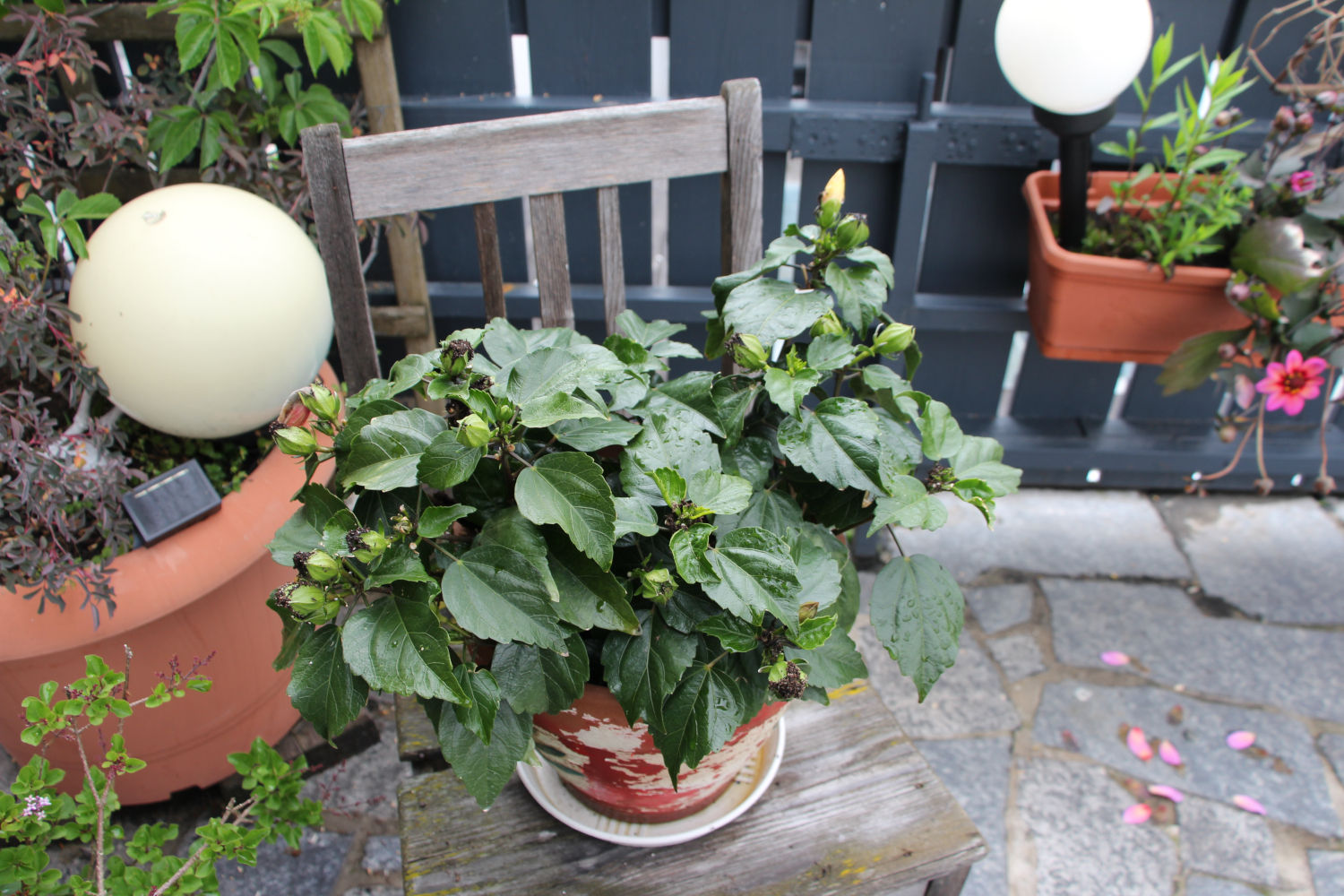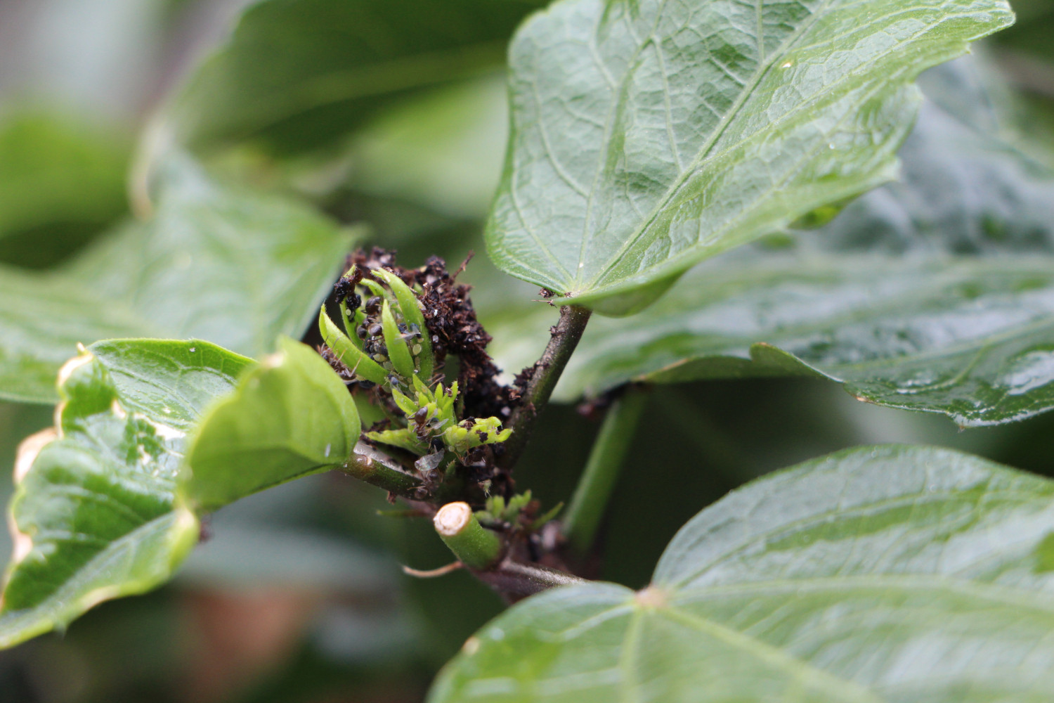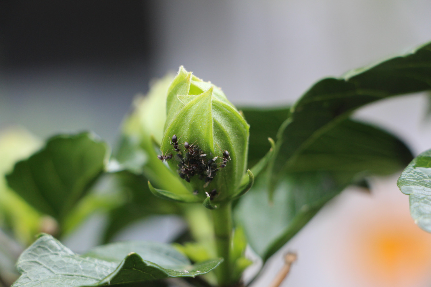 Dass Ameisen gerne Blattläuse hegen und pflegen, um an deren deliziöse Ausscheidungen zu kommen, konnte ich bereits beobachten. Auf der vor wenigen Wochen erworbenen Hibiskuspflanze nimmt dies jedoch, zumindest für mich, recht ungewöhnliche Ausmaße an. Statt sich, an der Pflanze herauf und herunter laufend, lediglich auf das Melken der Läuse zu beschränken, verbauen die Ameisen nun die Blüten bzw. das, was nach der Blüte davon übrig bleibt, mit Erde. Auch einen Stängel entlang ist schon ein wenig Erde. Das ist mir vor ein paar Tagen zurerst aufgefallen.
