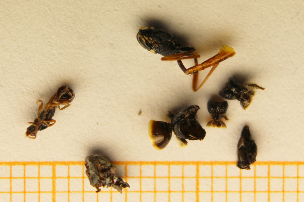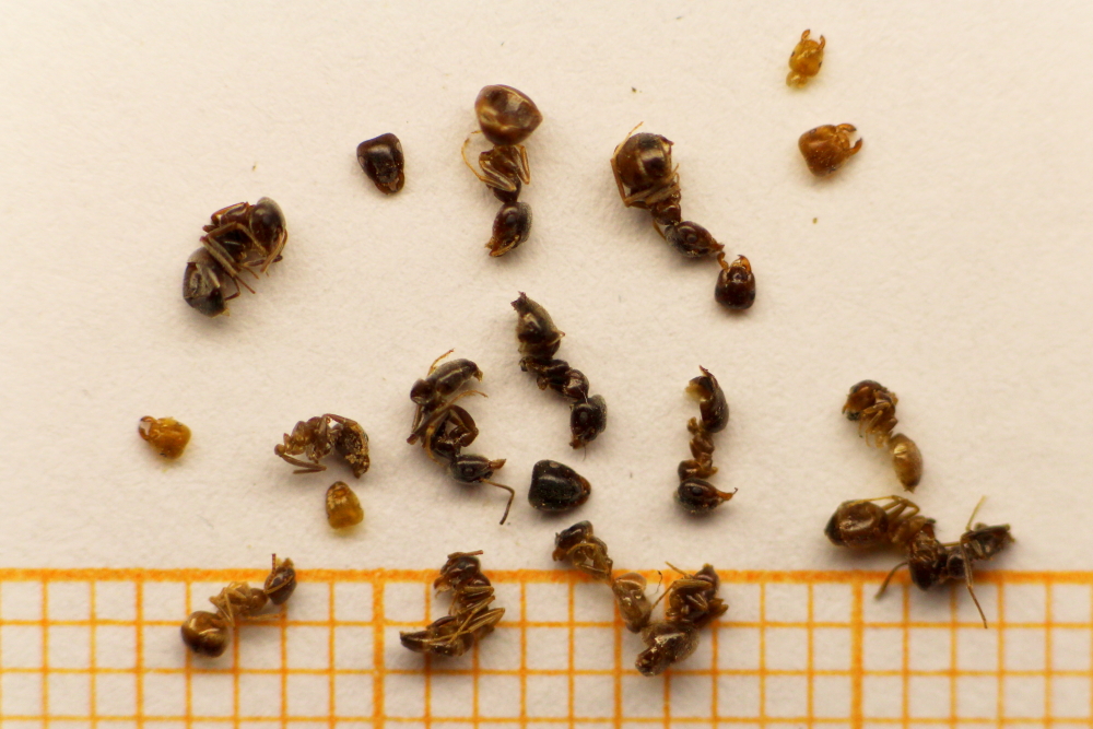 Die Vermutung, deshalb vielleicht Reste dieses Ameisen-Parasitoiden im Nestabfall finden zu können, hat sich beim Sortieren aber nicht bestätigt. Eventuell war das konkrete Volk gar nicht befallen, sondern benachbarte Nester. Oder die im Nest geschlüpften Wespen gelangen alle unbeschadet ins Freie.