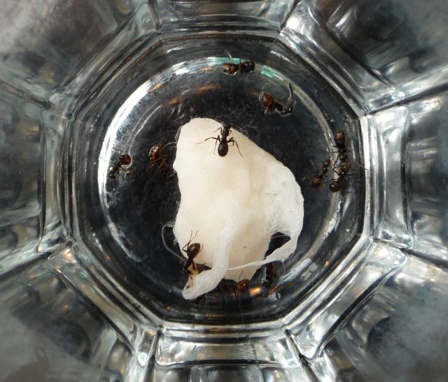 Die zur Versorgung der Puppen mitgesandten Arbeiterinnen sahen trotz feuchtem Wattebausch im Reagenzglas leider ziemlich mitgenommen aus. Ich legte sie umgehend in eine Schale mit etwas Wasser, um wenigstens einige zu retten.