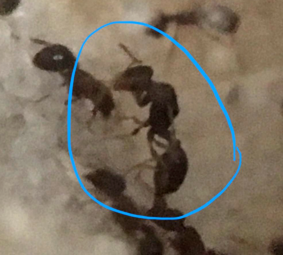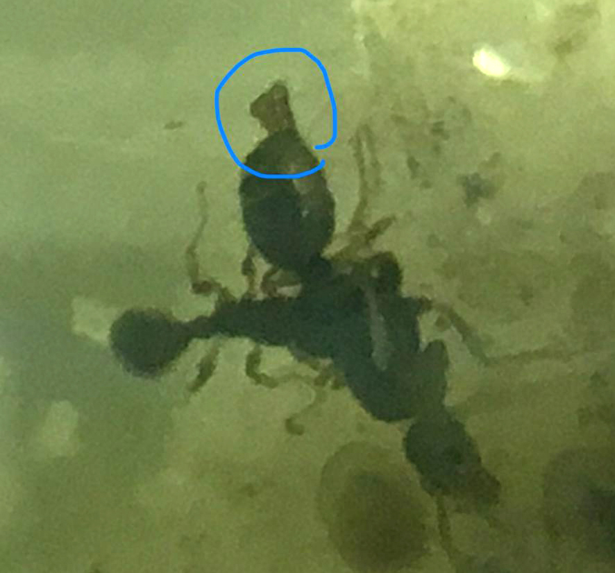 Auch Bild 8 zeigt eine typisch männliche “Ausstattung” der Tiere, mit Hoden. Sie erscheinen zwar kleiner als bei einem normalen Tetramorium-Männchen, sind aber eindeutig als solche erkennbar.