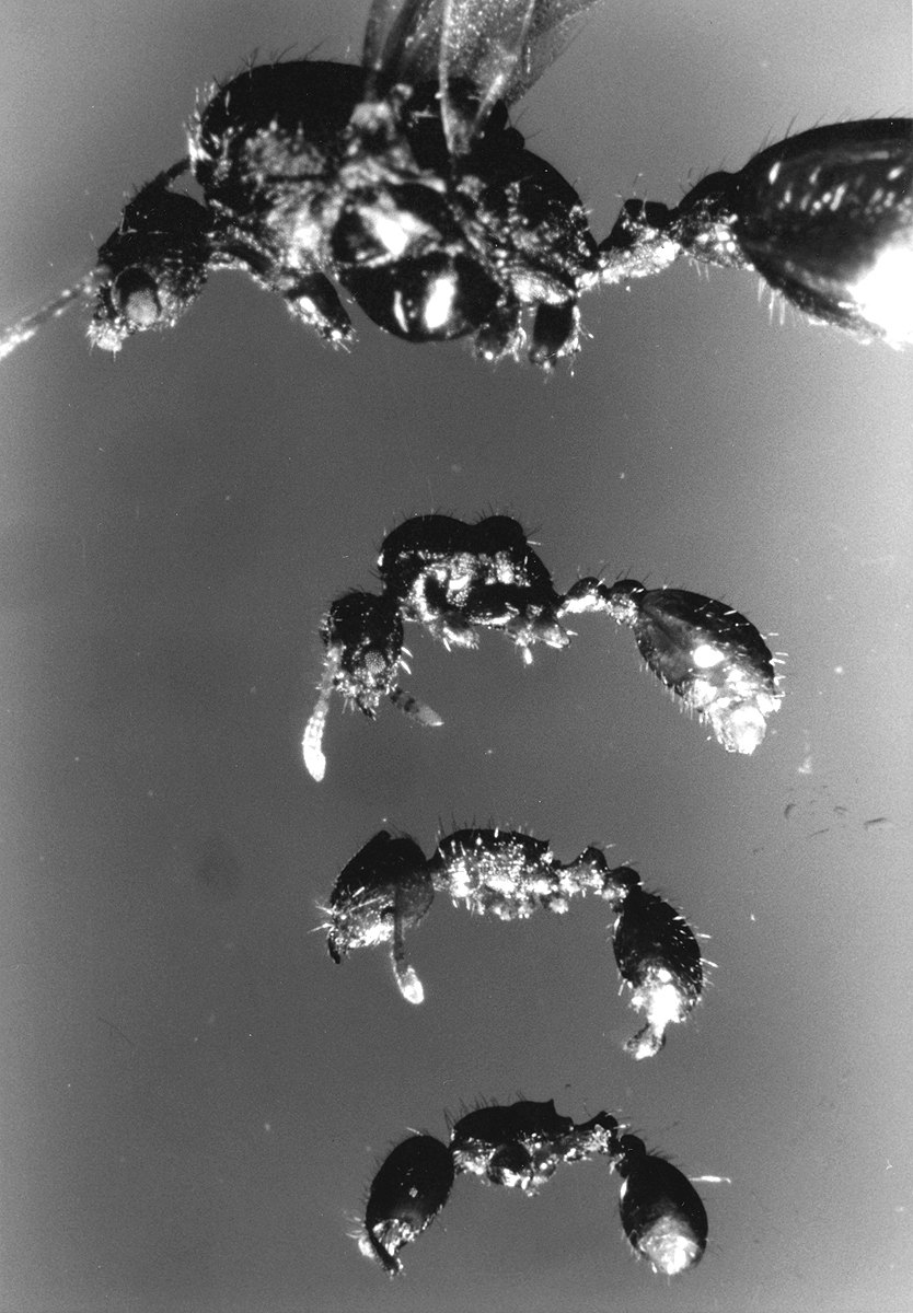 Unser ähnlicher Fall, von oben: Normales Männchen, männchenähnlicher Intersex, arbeiterinähnlicher Intersex (mit Gasteranhang!), normale Arbeiterin von Tetramorium sp.
