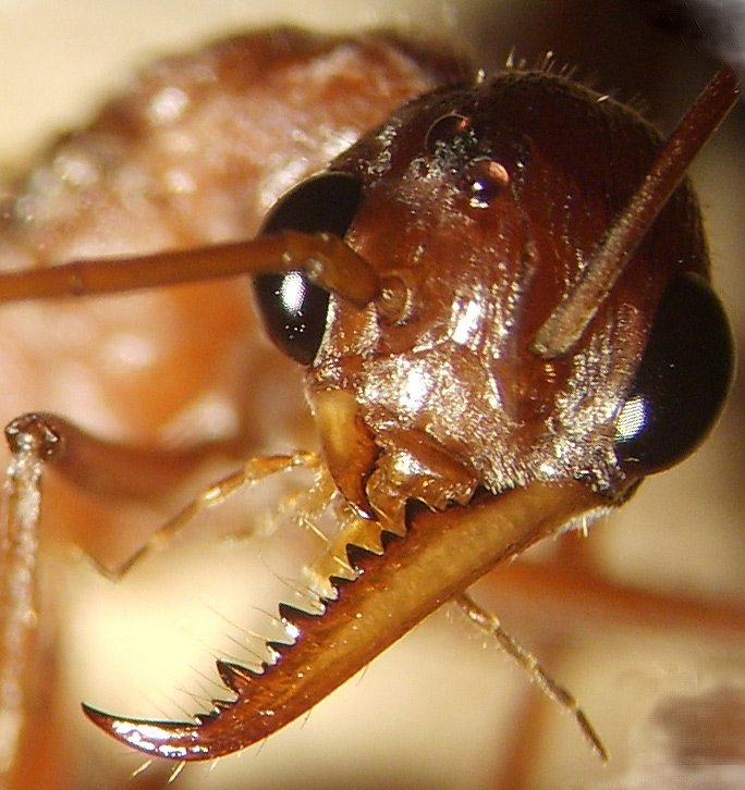 Die linke Mandibel ist lang und schön gezähnt, darunter (im Bild) erscheint das Mandibelchen der männlichen Hälfte geradezu mickrig! Das halbe männliche Köpfchen ist insgesamt so klein, dass sich der halbe Kopf der Arbeiterin geradezu darum herum legt!