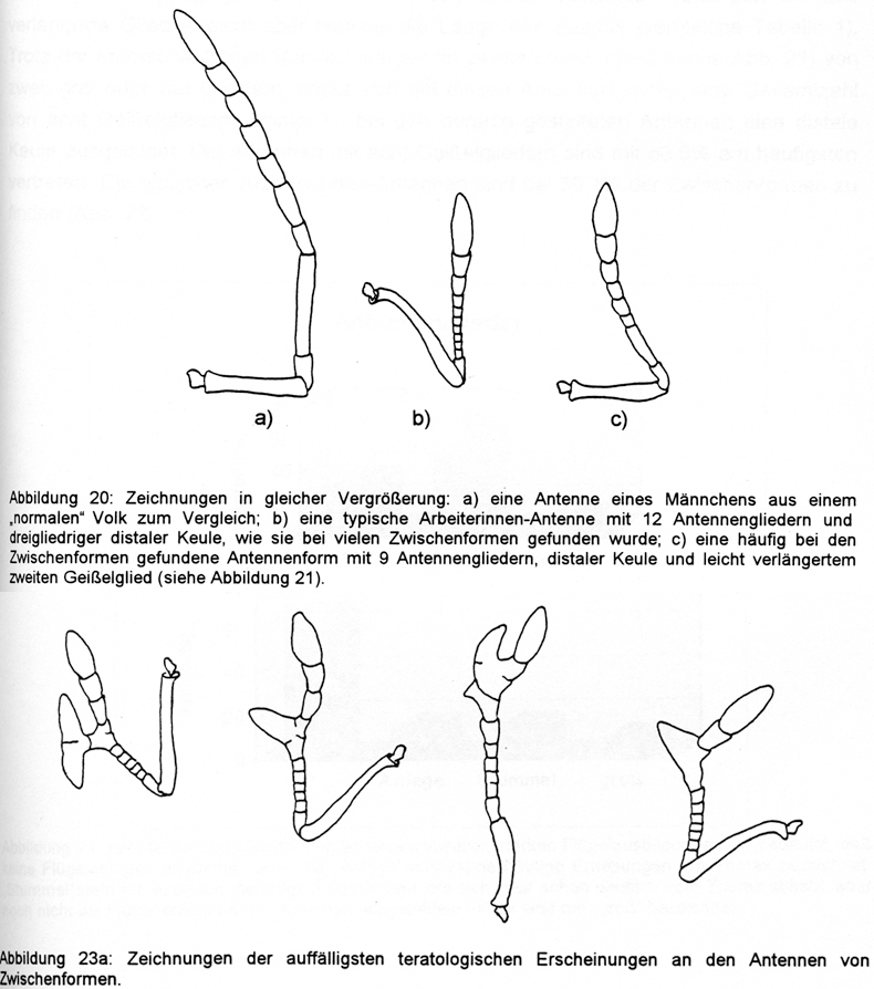 Antennen von oben: a) Männchen, b) Arbeiterin, c) Zwischenform,