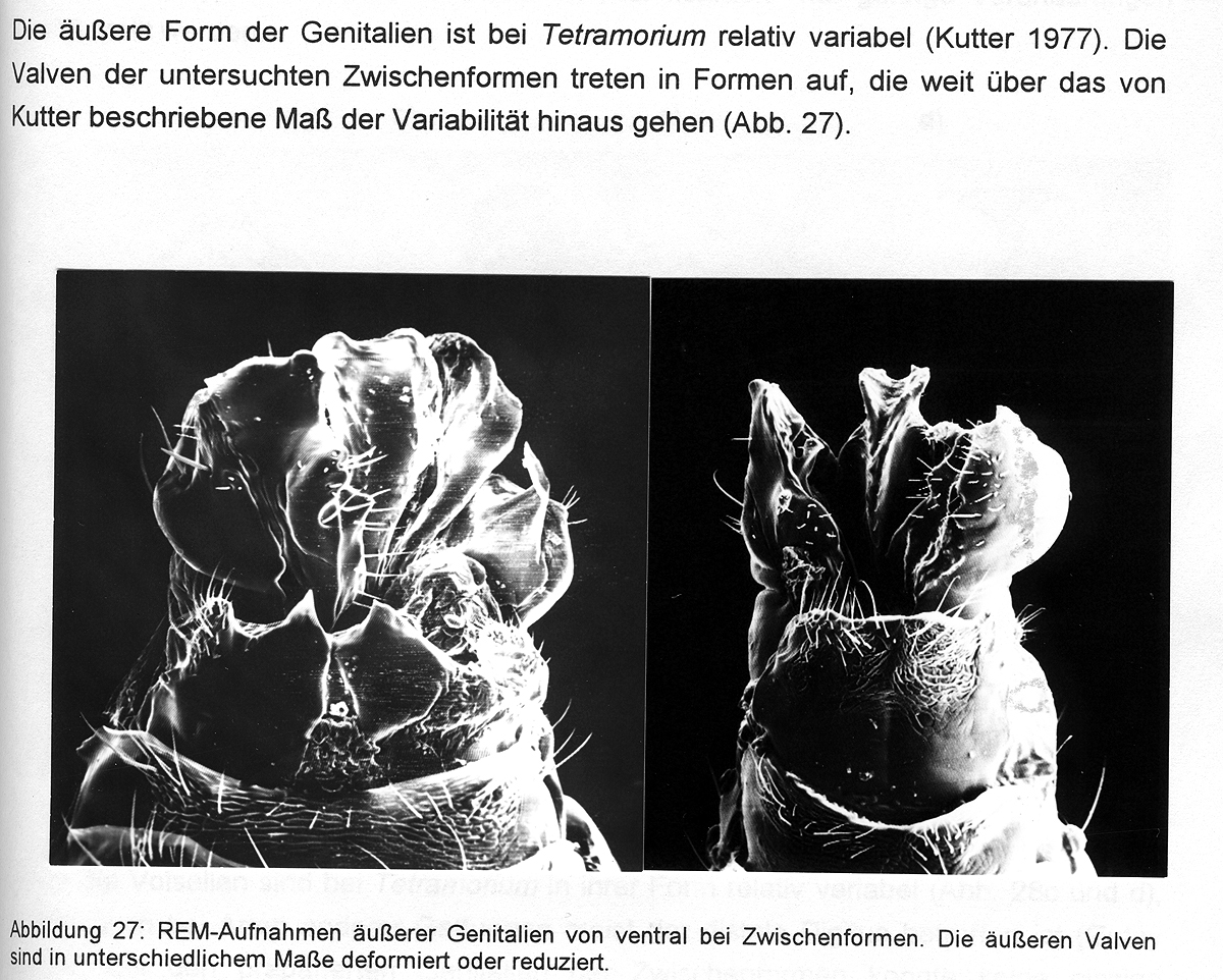 Auffällig ist die große Variabilität der Zwischenformen (Bilder 2,3,4), die im Habitus zum Teil fast wie normale Arbeiterinnen erscheinen, oder auch normalen Tetramorium-Männchen weitgehend gleichen, bis auf die viel geringere Größe. Sie alle haben Genitalanhänge, die denen normaler Männchen ähnlich sehen, wenn auch missgestaltet und kaum funktionsfähig (Bild 6).