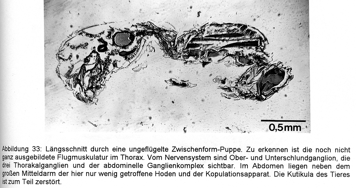 Alle Zwischenformen, ob mit oder ohne Flügelrudimente, hatten im Puppenstadium Flugmuskulatur angelegt.