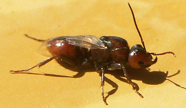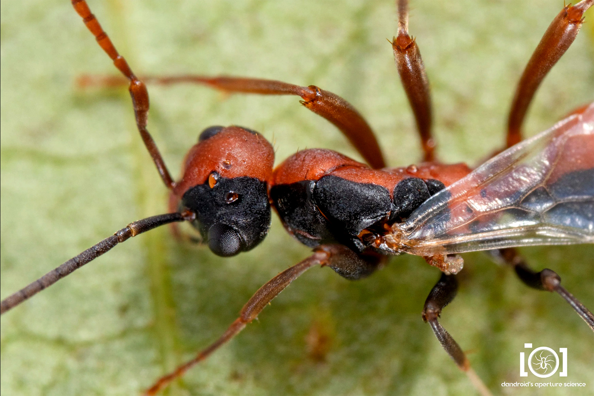Ich zeige zunächst mal das ganze Tierchen im Überblick. Auffällig ist die linke Antenne, schön „gekniet“ mit langem Schaft, wie sich das für eine Arbeiterin gehört, und die rechte Antenne, mit ganz kurzem Schaft und ellenlanger Geißel, die an Schlupfwespen erinnert.