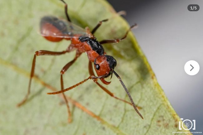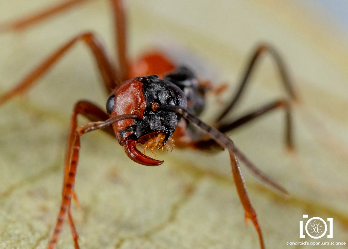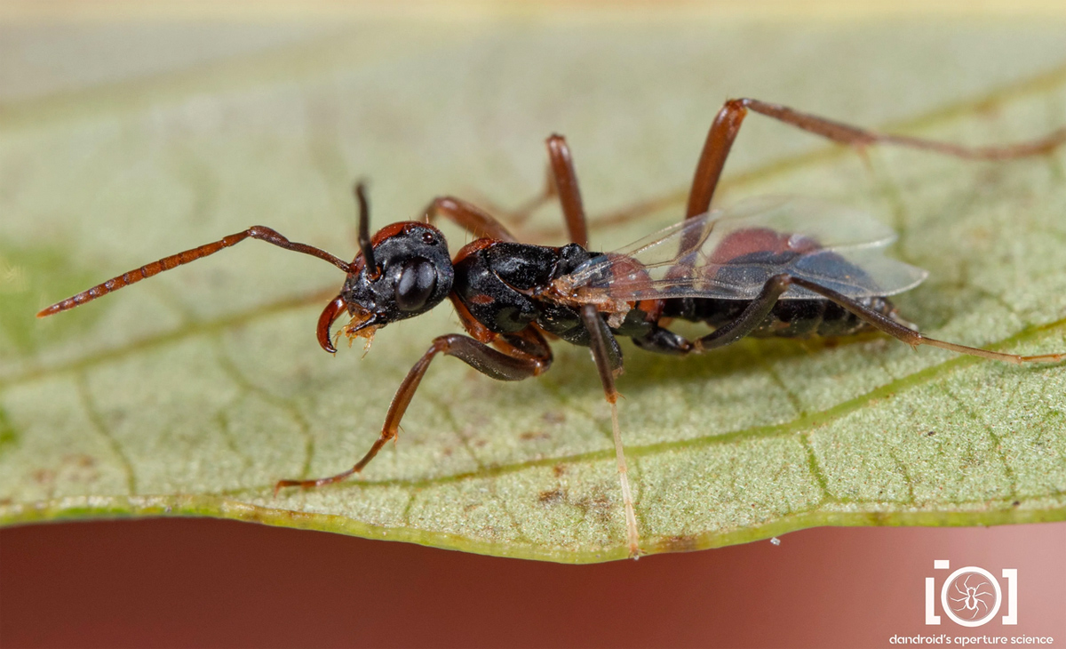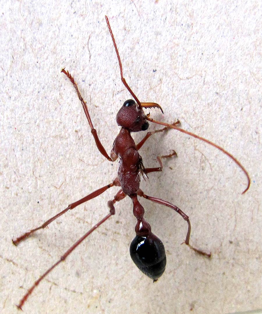 Bemerkenswert: Im Startbeitrag hier wird eine Polyergs rufescens mit Flügeln auf der männlichen und der weiblichen Seite gezeigt; die „weibliche Hälfte“ sollte also eine Jungkönigin werden. Bei dem in Reddit gezeigten Tier ist die weibliche Seite flügellos, also „Arbeiterin“, so wie bei der hier vorgestellten Myrmecia pavida.