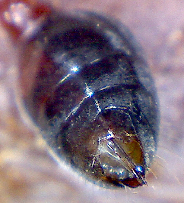 Bild 2 zeigt das Ganze noch mal vergrößert. Man sieht links ganz am Hinterende (im Bild unten) auch ein sehr asymmetrisches Chitinteil, das die obere Abdeckung (Tergit) des letzten Segmentes bilden sollte.
