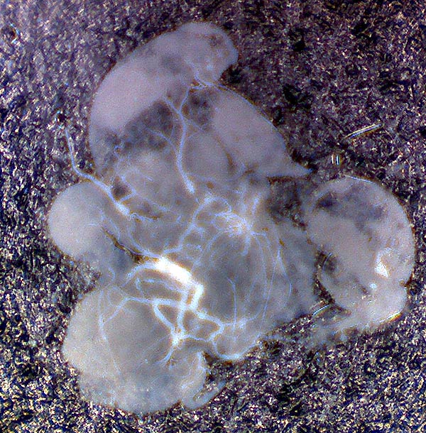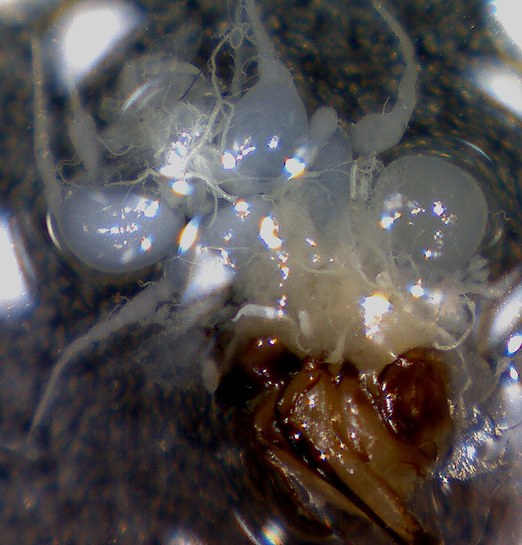 Bild 5 sollte Hodenfollikel zeigen; zumindest stimmten diese in einer Gruppe angeordneten blasigen Gebilde mit dem überein, was ich in Männchen anderer Arten gesehen habe. Der Inhalt bestand aus zahllosen winzigen Zellen, heranreifenden Spermien. - Das hier besonders auffällige weiße „Gespinst“ sind Tracheen, die wegen ihres Luftinhalts das Licht total reflektieren.
