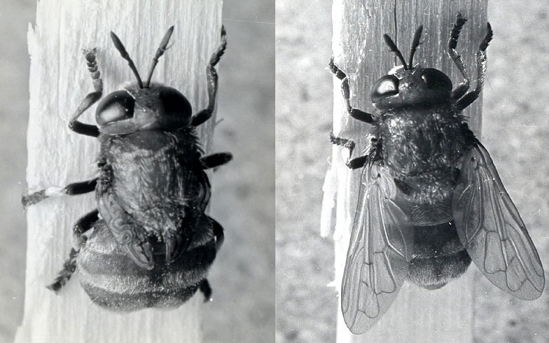 Microdon-Fliege zur Hand, aber man sieht sehr schön die unmittelbar nach dem Schlupf noch gefalteten Flügel, und daneben die Fliege mit „aufgepumpten“, entfalteten Flügeln, die nur noch aushärten müssen.