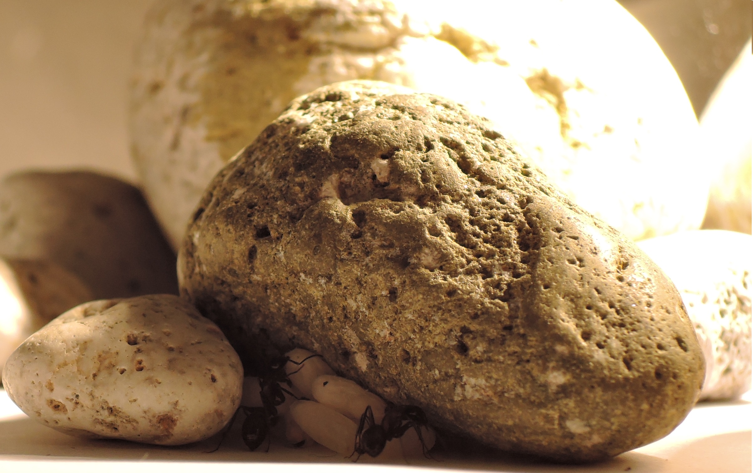 wie einige von Euch schon in meinem kleinen Video gesehen haben, gebe ich meiner Kolonie ab und an etwas Wärme durch eine Lampe (12-18 Uhr). Zu Beginn haben sie dann immer ihre Puppen herausgebracht und sie unter dem erhitzten Stein gelagert. Mittlerweile bringen sie ihre gesamte Brut heraus, es bleiben nur die Königin und eine Arbeiterin im Nest zurück. Erst erwärmen sich ein paar Damen für 1 bis 2 Stunden und hiernach folgt die große Migration.