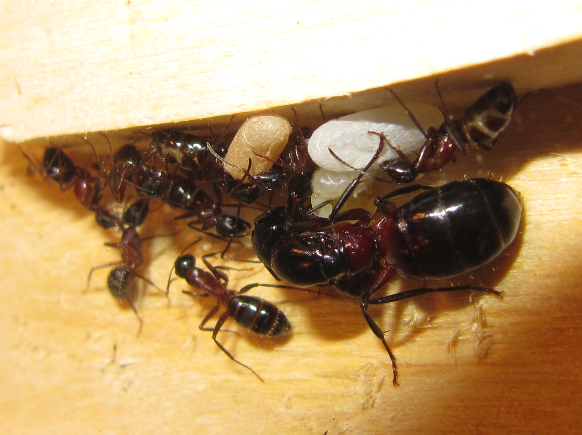 ) 2 Larven und 20+ Eier. Wenn von den jetzigen 10 Arbeiterinnen keine stirbt, können die 50 sogar dieses Jahr noch geknackt werden. Mal schauen was die Zukunft bringt, bei der Art kann übermorgen die Gyne auch auf einmal tot im Nest liegen...