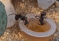 Die Tiere lassen sich nur selten blicken. In den Abendstunden sieht man ab und zu 1-2 Ameisen in der Arene. Die Tiere sind sehr schnell und laufen problemlos an Glas.