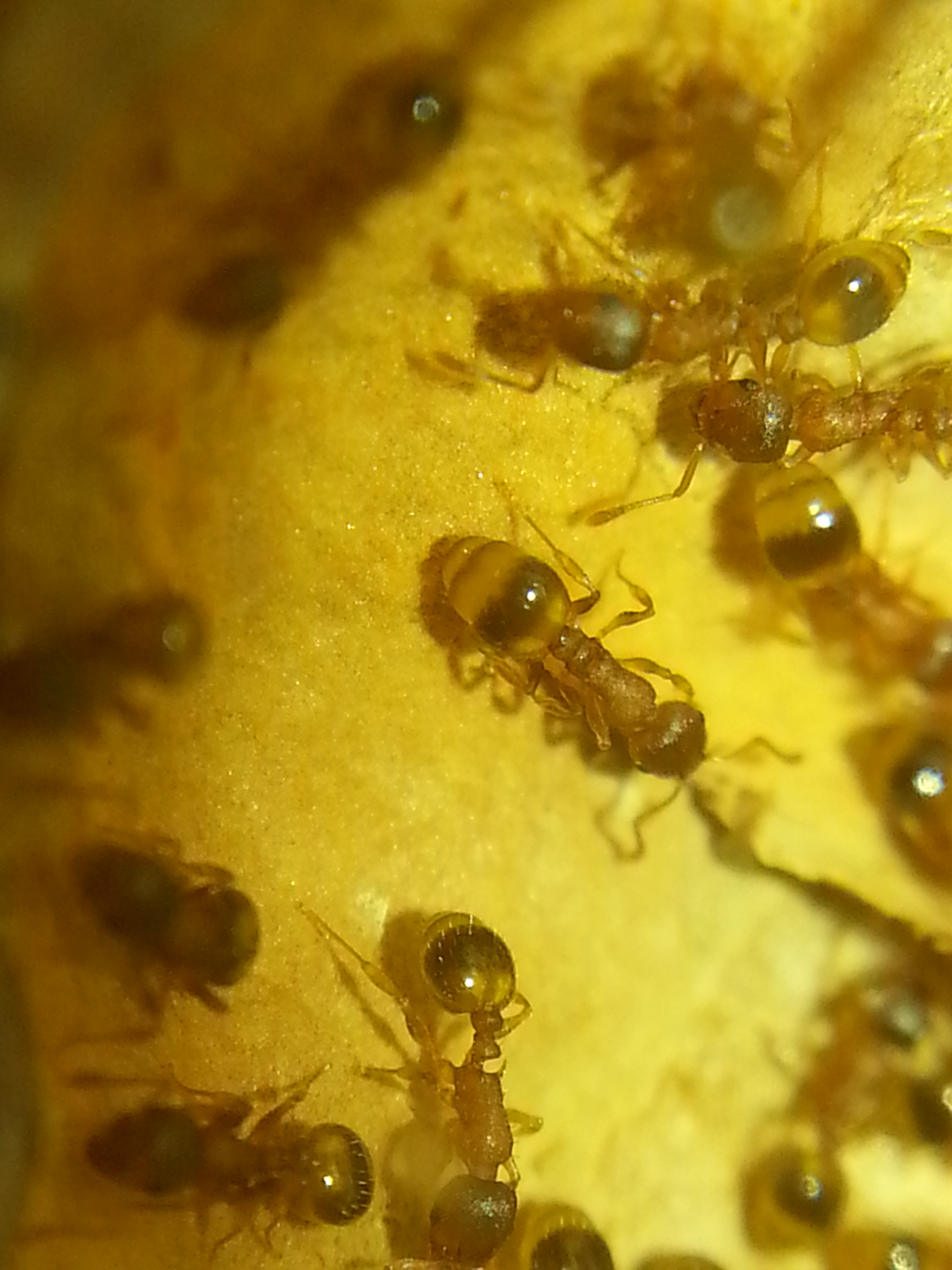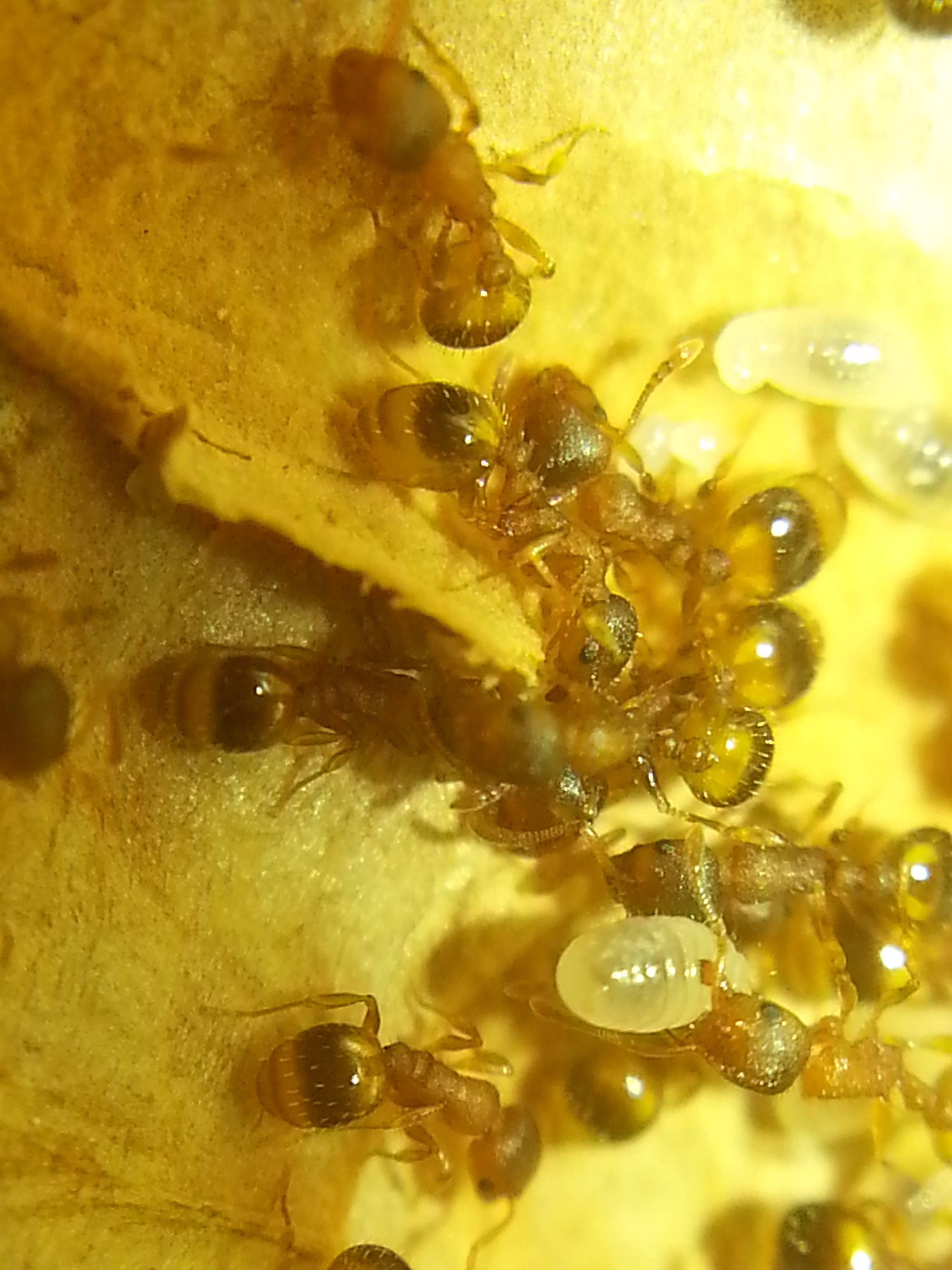 Ich habe im Moment mehrere Temnothorax Kolonien in der Winterruhe im Kühlschrank. Hier geht es speziell um zwei Kolonien : die eine ist ziemlich groß, lebt in einer Walnuss und hat sehr wahrscheinlich keine Königin. Die zweite spielt nur indirekt eine Rolle - nach ihrer Umsiedlung von der angebrochenen Eichel, in ihr neues Zuhause (im Moment eine halbe Haselnuss) fand ich insgesamt 3 Gynen (einmal zwei und das andere mal eine alleine) innerhalb des Formikariums, welche Krampfhaft versuchten zu entkommen.