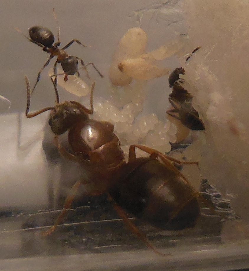 Eine Königin ist jedoch anders: Sie ist rötlich, ihre Pygmäen schlüpften rund eine Woche bis 10 Tage später als bei den schwarzen Königinnen, auch sind es bisher nur 2 Pygmäen, wobei die schwarzen Königinnen schon alle so um die 8 Pygmäen haben.