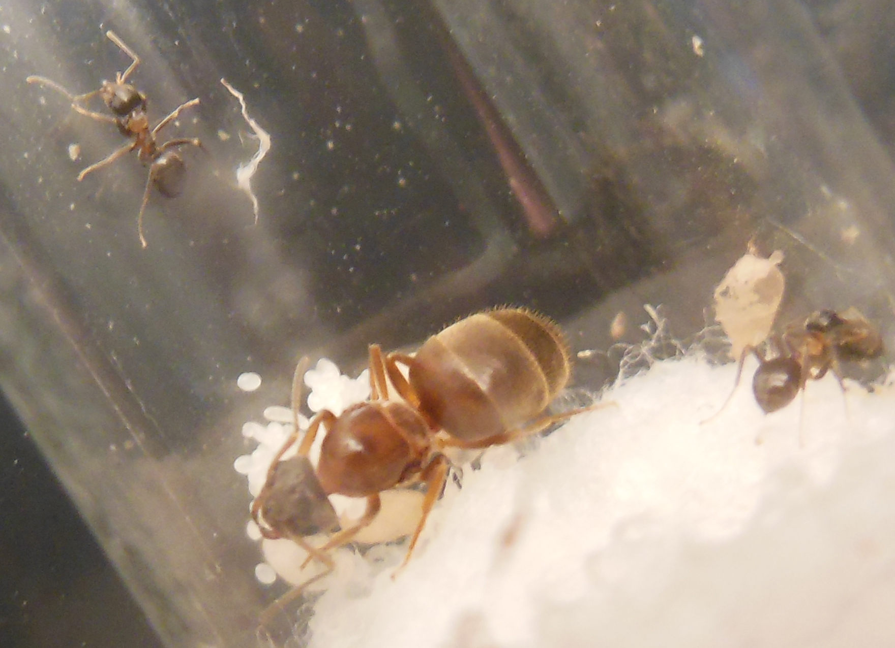 Bei den schwarzen Königinnen bin ich ziemlich sicher dass es sich um Lasius cf niger handelt - mit der gegebenen Fehlerquote eines Laien :D Bei der roten allerdings habe ich keine Ahnung was mir da ins RG geraten ist - und ich habe nun bedenken, etwas gefährliches wie die Pharaoameise oder etwas geschütztes wie die Waldameise erwischt zu haben; wobei diese Beispiele bei der Grösse wohl nicht in Frage kommen (Gyne misst ca. 10mm, die Pygmäen ca. 3,5 - eigentlich fast identisch mit den schwarzen Kolonien).