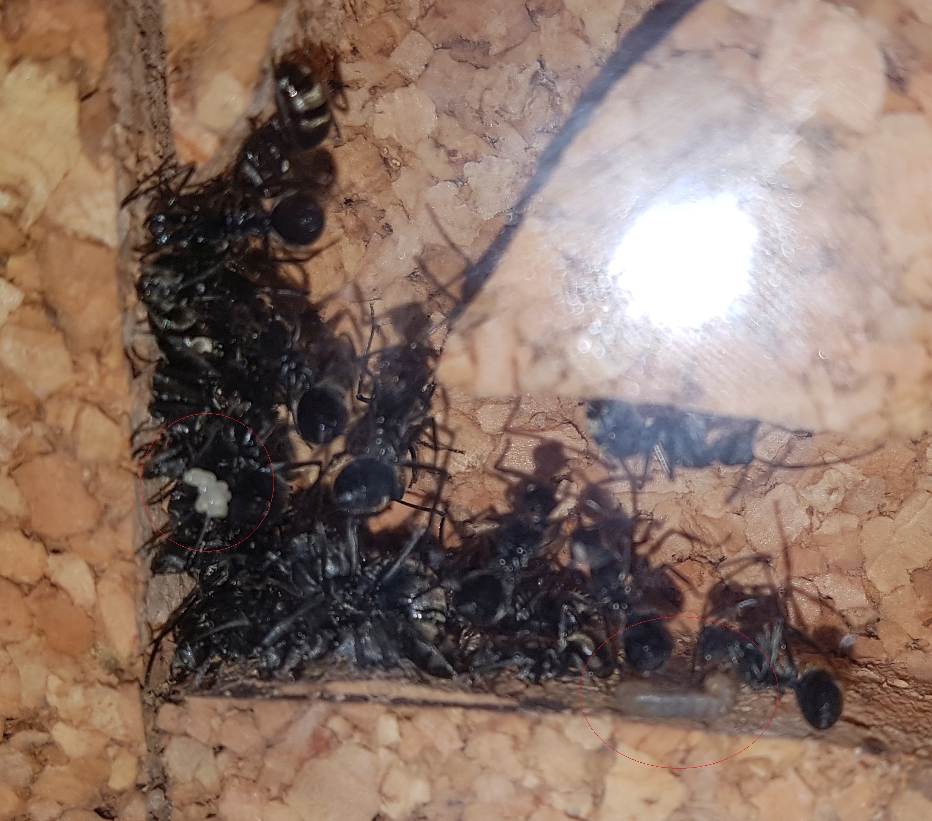 Nestbereich. Hier ist die Farbe der Larve wie auch der Eier zu sehen. Die Eier scheinen einfach weiß, die Larven eher gräulich zu sein.