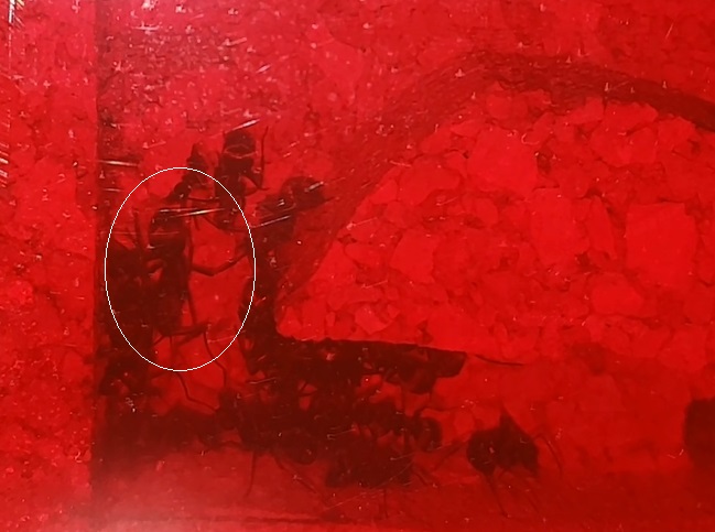 Da die Königin bei Lichteinfall im Nest sofort geschützt wird, konnte ich bisher nur unter nutzung der roten Folie einen Blick erhaschen. Die Königin befindet sich in der Mitte, nächstes Foto mit Markierung.