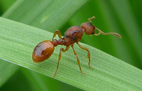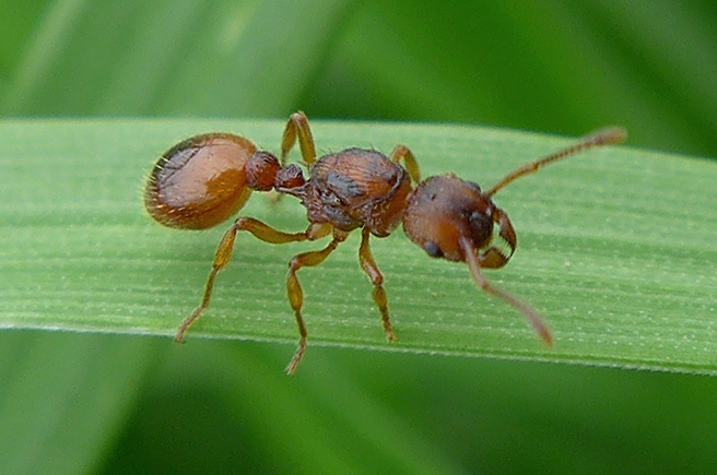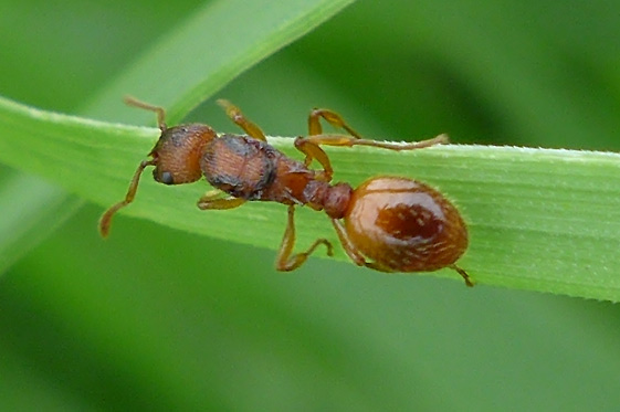 Ich denke, dass es sich hier nicht um eine M. ruginodis-Gyne handelt. Auf zumindest einem Foto ist am Antennenschaft beiderseits ein Knick zu erkennen, dieser dürfte bei ruginodis nicht vorhanden sein, weil dort der Antennenschaft ähnlich wie bei M. rubra kontinuierlich leicht nach außen hin gekrümmt ist. Es gibt eine ganze Reihe v. Myrmica sp., die einen angedeuteten bis zu ausgeprägten Knick im Schaft aufweisen. Es gibt auch Arten, wo zwar ein angedeuteter Knick, aber kaum ein Lobus vorhanden ist. Ich würde sagen: Myrmica sp.