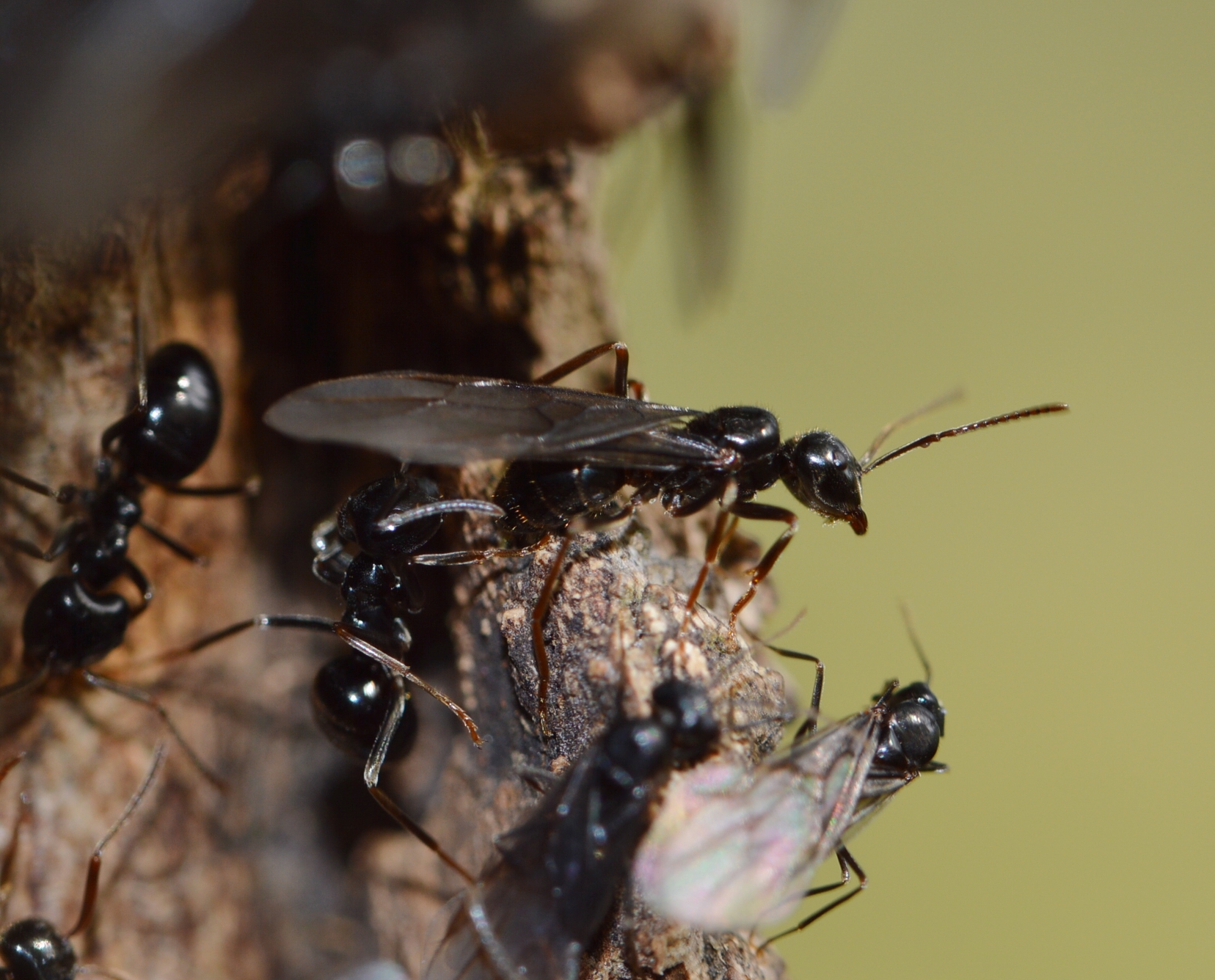 Wenn Brut transportiert wird, steht ein Umzug ins Haus. Die Geschlechtstiere können tatsächlich in diesem Zusammenhang, aber auch durch etwaige Spechtattacken aufgescheucht sein. Bei den meisten Arten werden die Geschlechtstiere anlässlich einer Nestverlagerung getragen, die Hoheiten gehen selten zu Fuß! Aber allein die Anwesenheit ausgefärbter Geschlechtstiere ist schon reichlich früh...