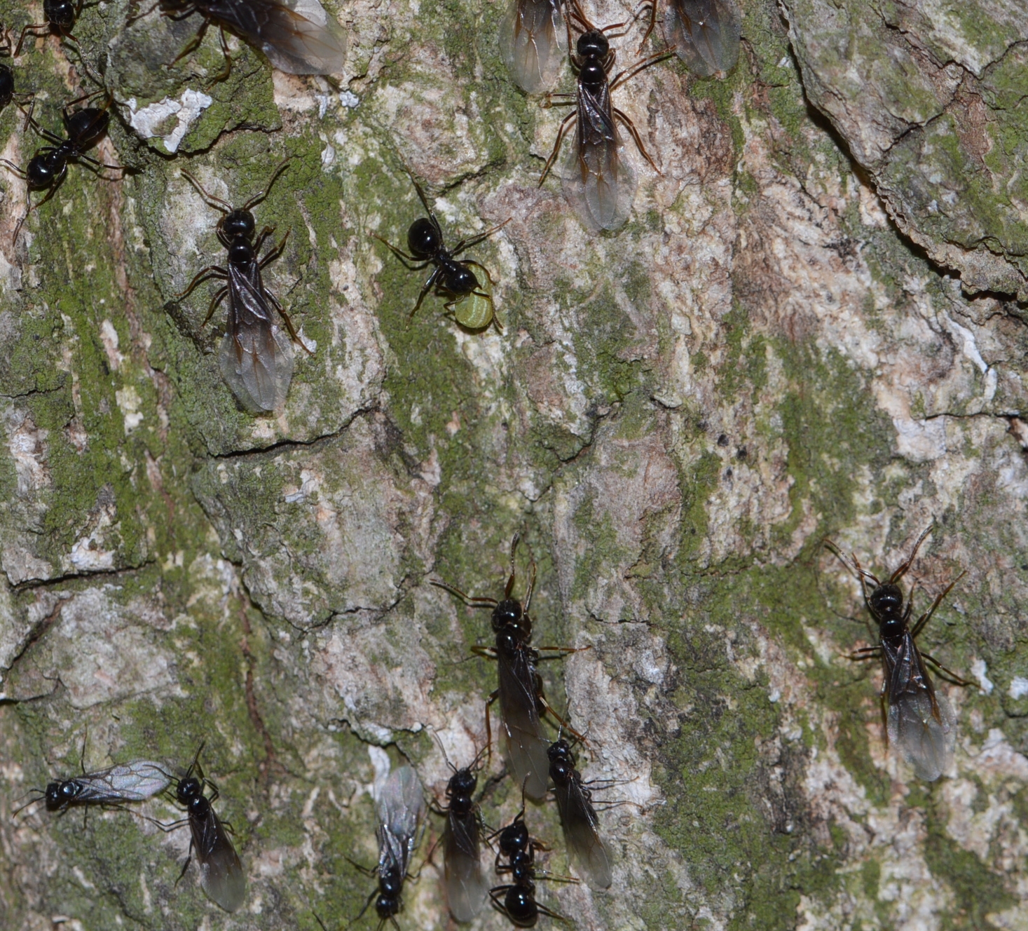 Für mich sieht es jetzt auch eher nach einen Nestumzug aus als nach einem "Schwarmflug " aus, die Ameisen sind sehr hektisch, Brut wird transportiert und es sind unzählige Ameisen unterwegs.