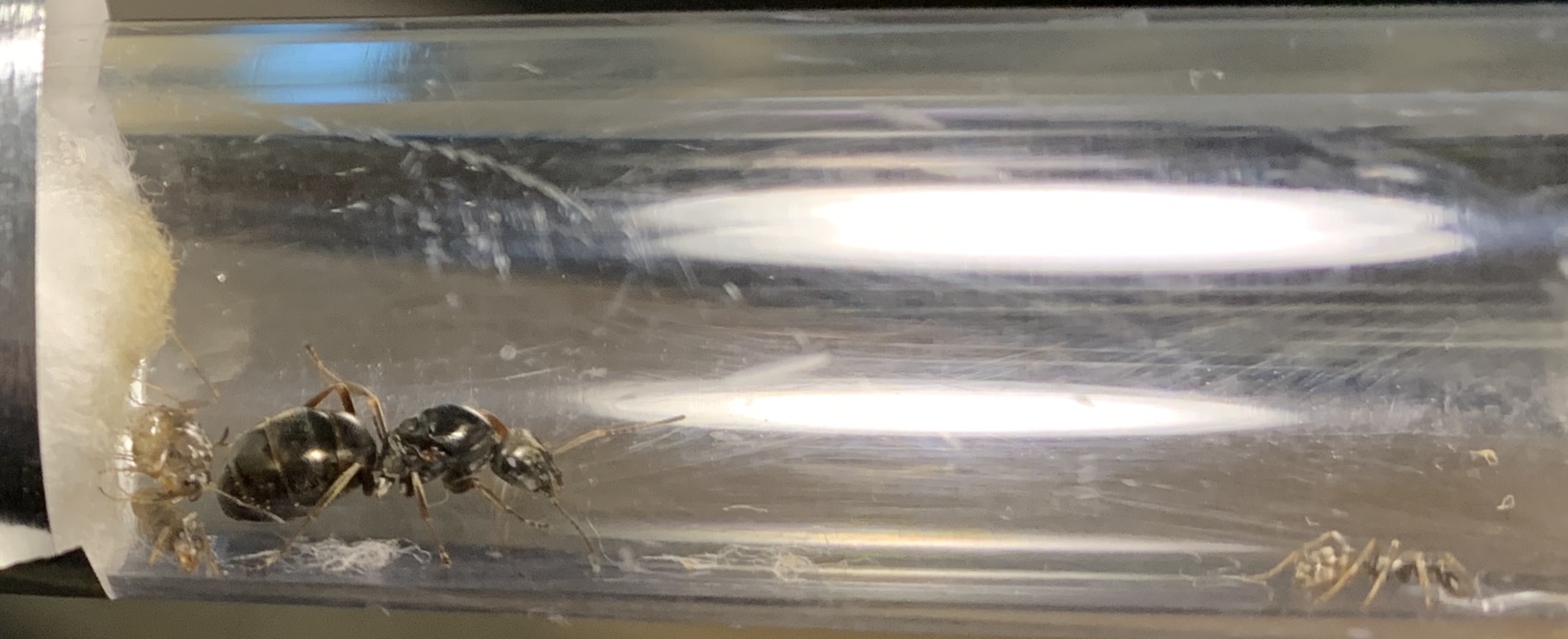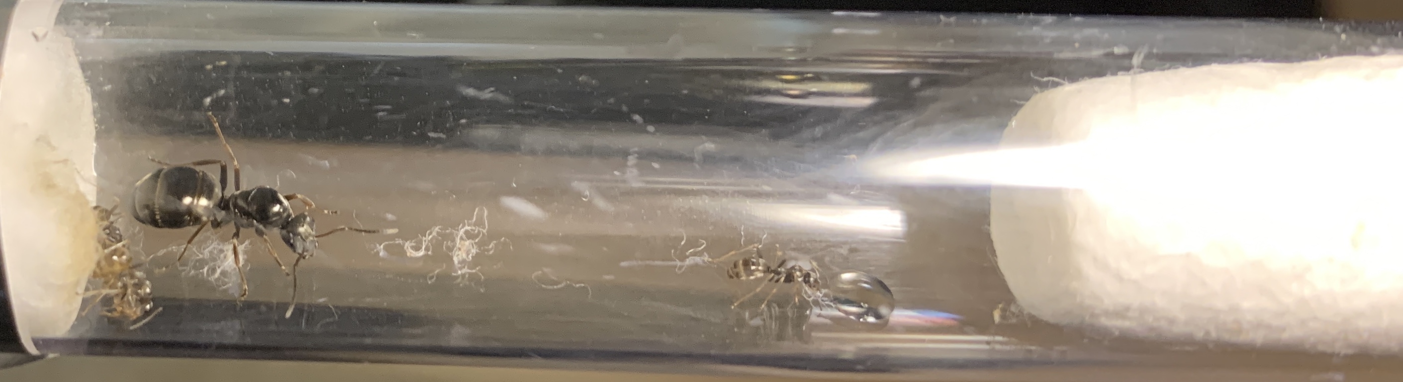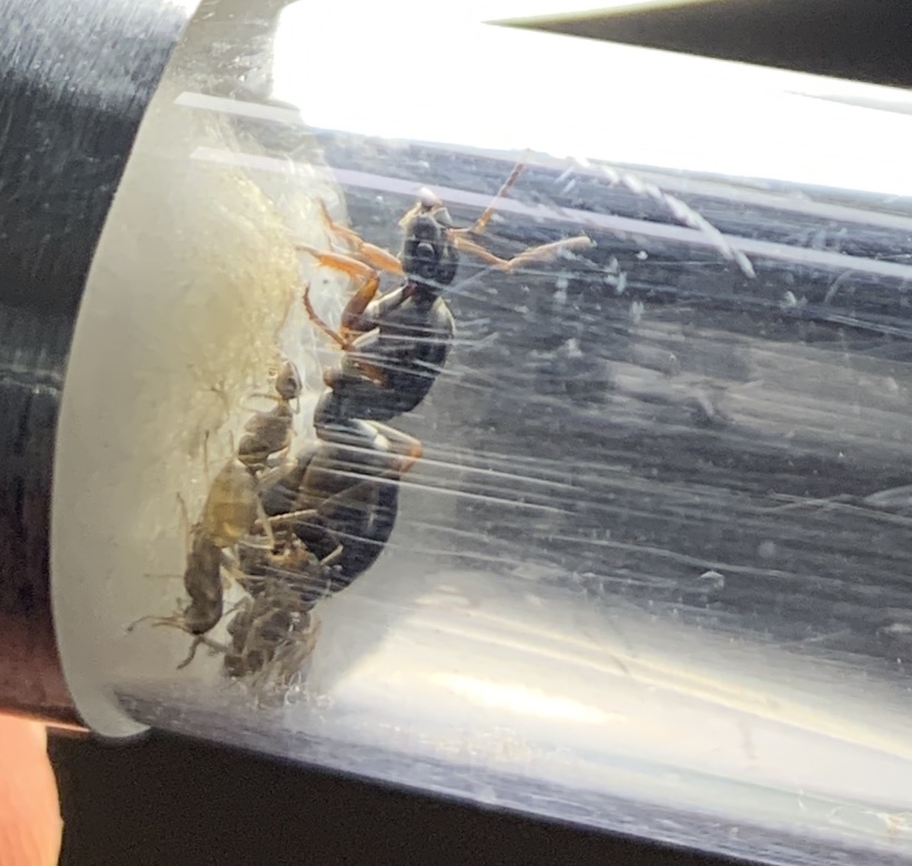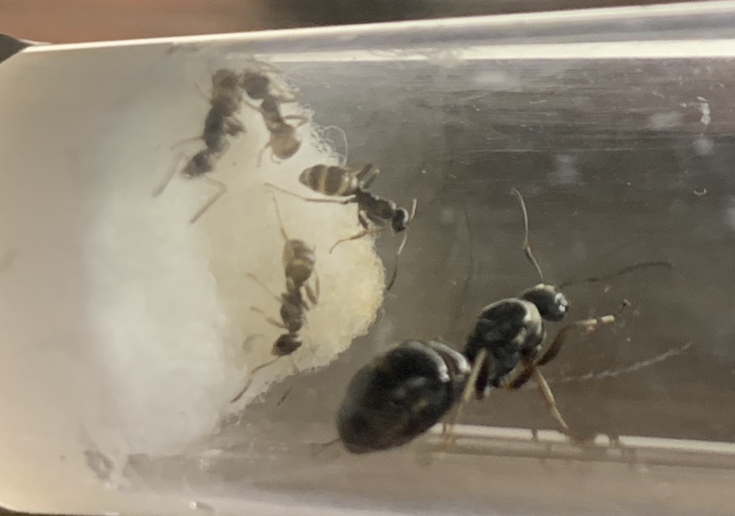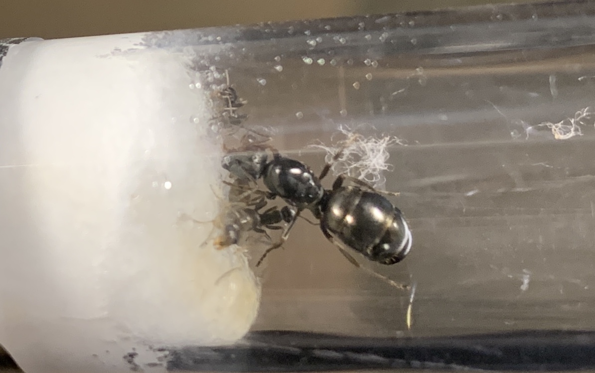 Im Vergleich zu meinen Lasius cf niger Kolonien bzw. Königinnen würde ich die die gute Dame als hochbeinig, flink und aggressiv bezeichnen. Sie ist wirklich schnell und die Färbung gleicht einem tiefen schwarz in hochglanz. Das ist bei den Bildern leider kaum zu erkennen. Habe für die Bilder keinen Toaster benutzt aber die Handy-Kamera gibt effektiv nicht mehr her.