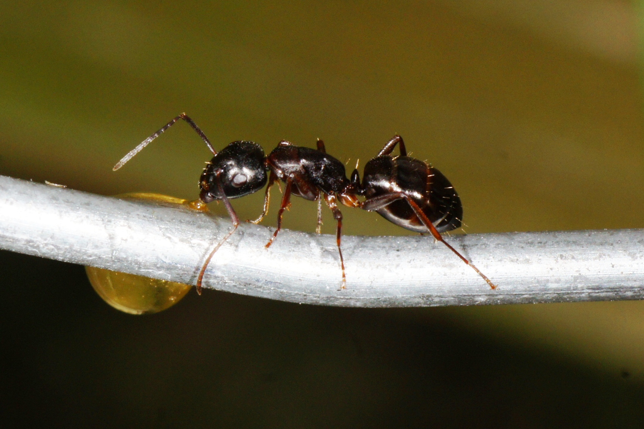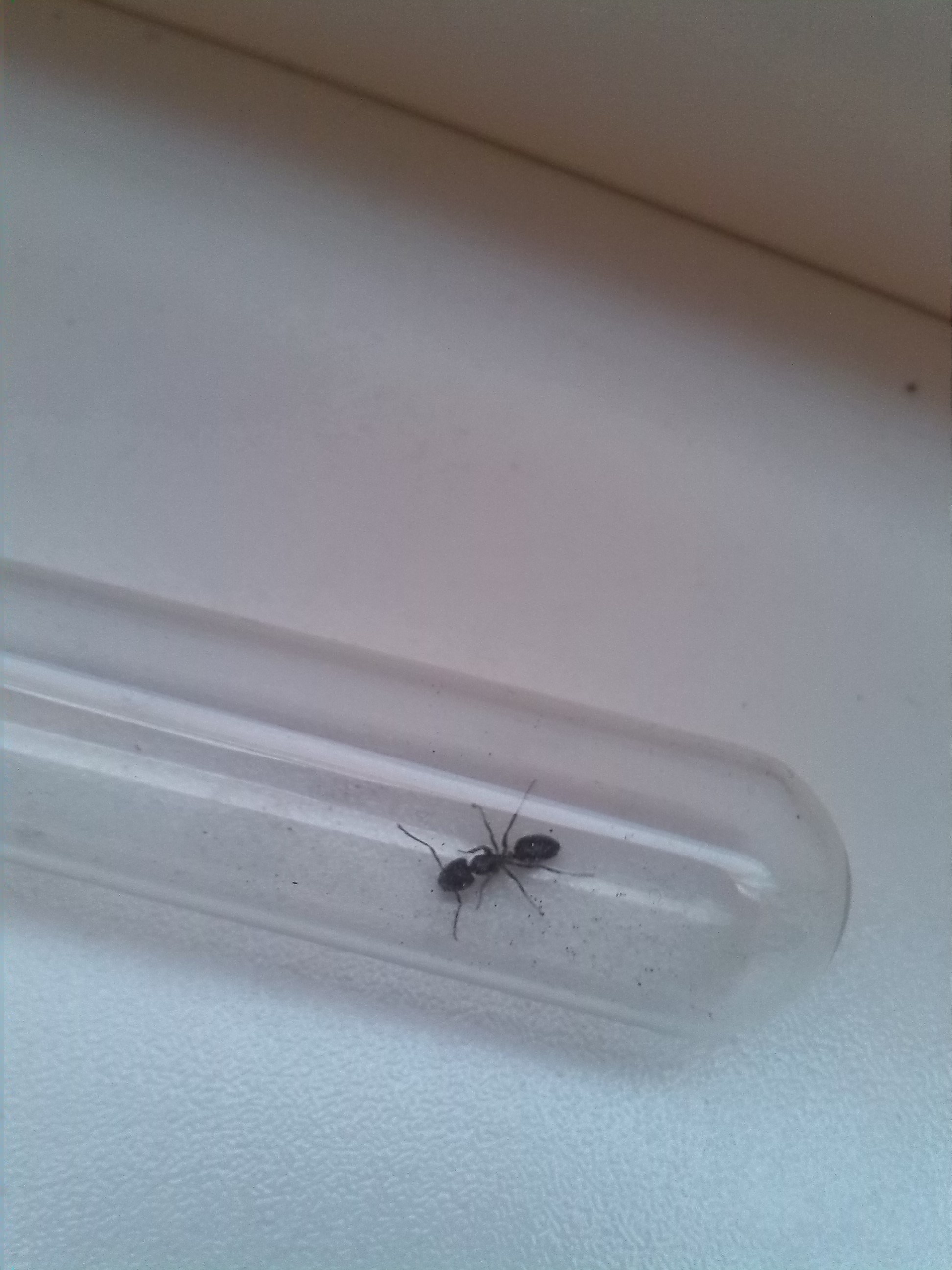 Ich sah sie mir genauer an und bemerkte das sie 3 kleine Larven in ihren Mandibel trug. Ich dachte sofort an eine Lasius fuliginosus. Drinnen unter hellem Licht nochmal genauer angesehen und bermerkt das sie nicht glänzend schwarz sondern eher matt ist. Außerdem hat sie einen eher bräunlichen Thorax was mich ebenfalls zu einem Camponotus Mayor tendieren ließ. Doch in Berlin eine Camponotus?! Ich habe hier zuvor noch nicht eine Arbeiterin dieser Gattung antreffen können.