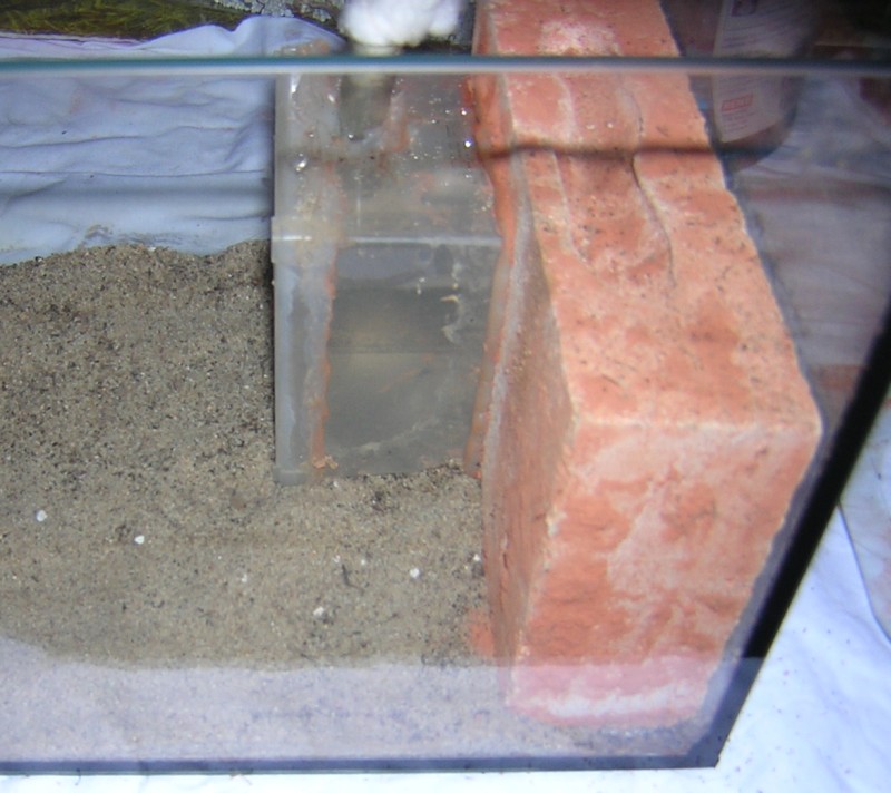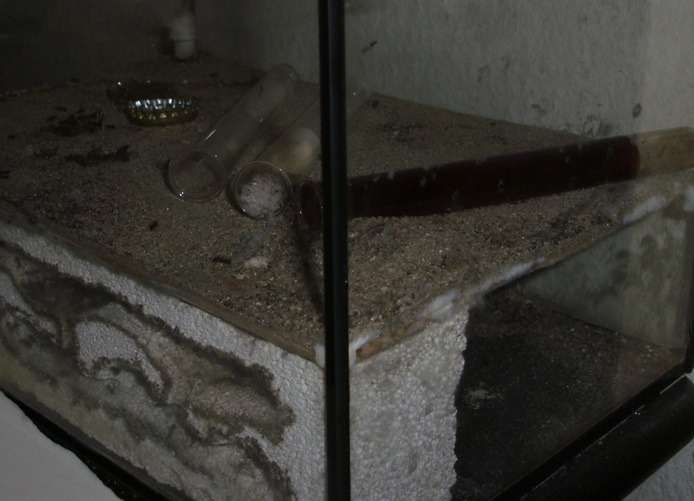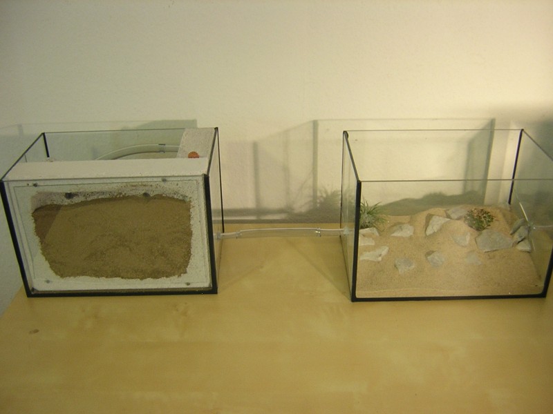 Hier habe ich eine Wassertank-Lösung versucht in der ein Aquarium(ohne Bohrungen) den Wassertank bildet und sowohl ein trockener als auch ein feuchter Nestbereich entsteht.
