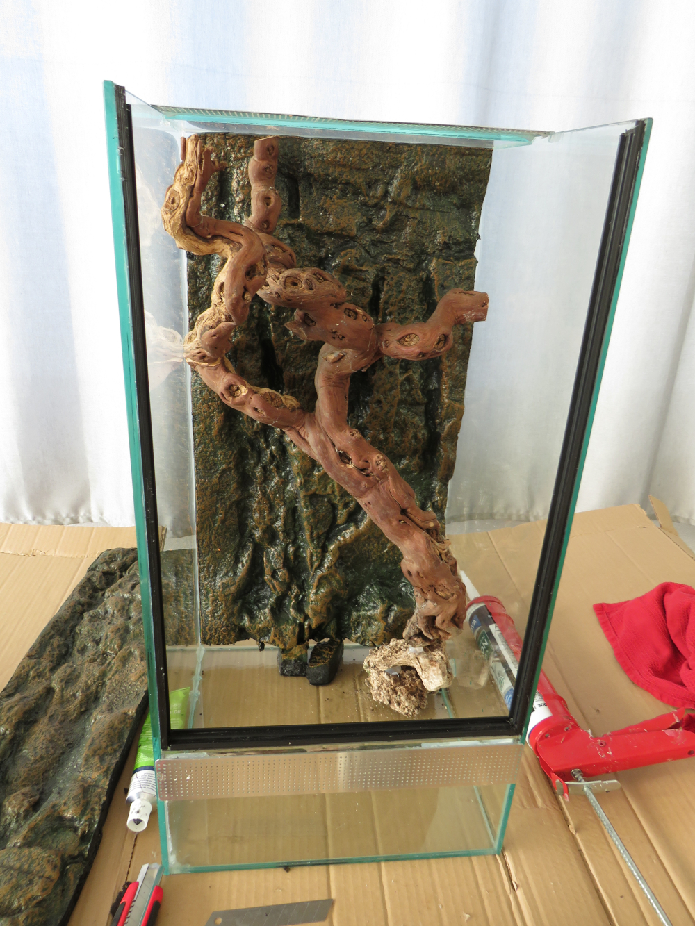 Danach mussten schon die ersten Dekorationsmaterialien wie die Rückwand und die Wurzel im Terrarium verklebt werden, weil sie später nicht mehr durch die Öffnung gepasst hätten. Damit die Wurzel im feuchten Untergrund nicht fault, wird sie am unteren Ende auf einen Stein gestellt und an der Rückwand verklebt.