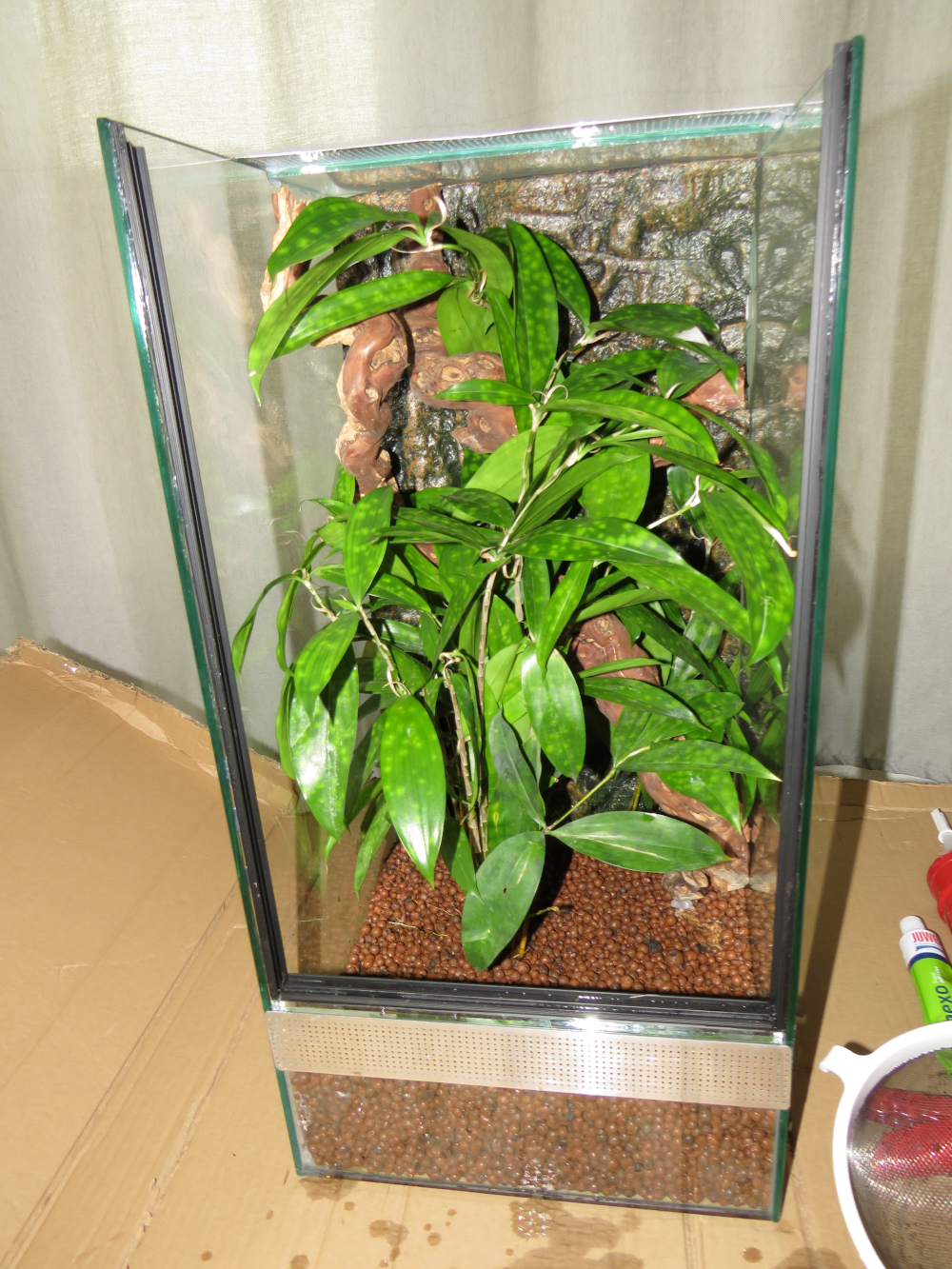 Danach wurde Blähton als Bodengrund eingefüllt. Die Hydrokultur sorgt für eine optimale Luftfeuchtigkeit im Tropenbecken. In den Bodengrund kamen danach die Pflanzen. Bei mir hat sich der „Bambus-Drachenbaum“ Dracaena surculosa als recht robuste und wuchsfreudige Pflanze bewährt. Natürlich wurden die Pflanzen vor der Verwendung abgewaschen und einige Monate bei mir stehen gelassen um zu vermeiden, dass Pestizide ins Terrarium gelangen.