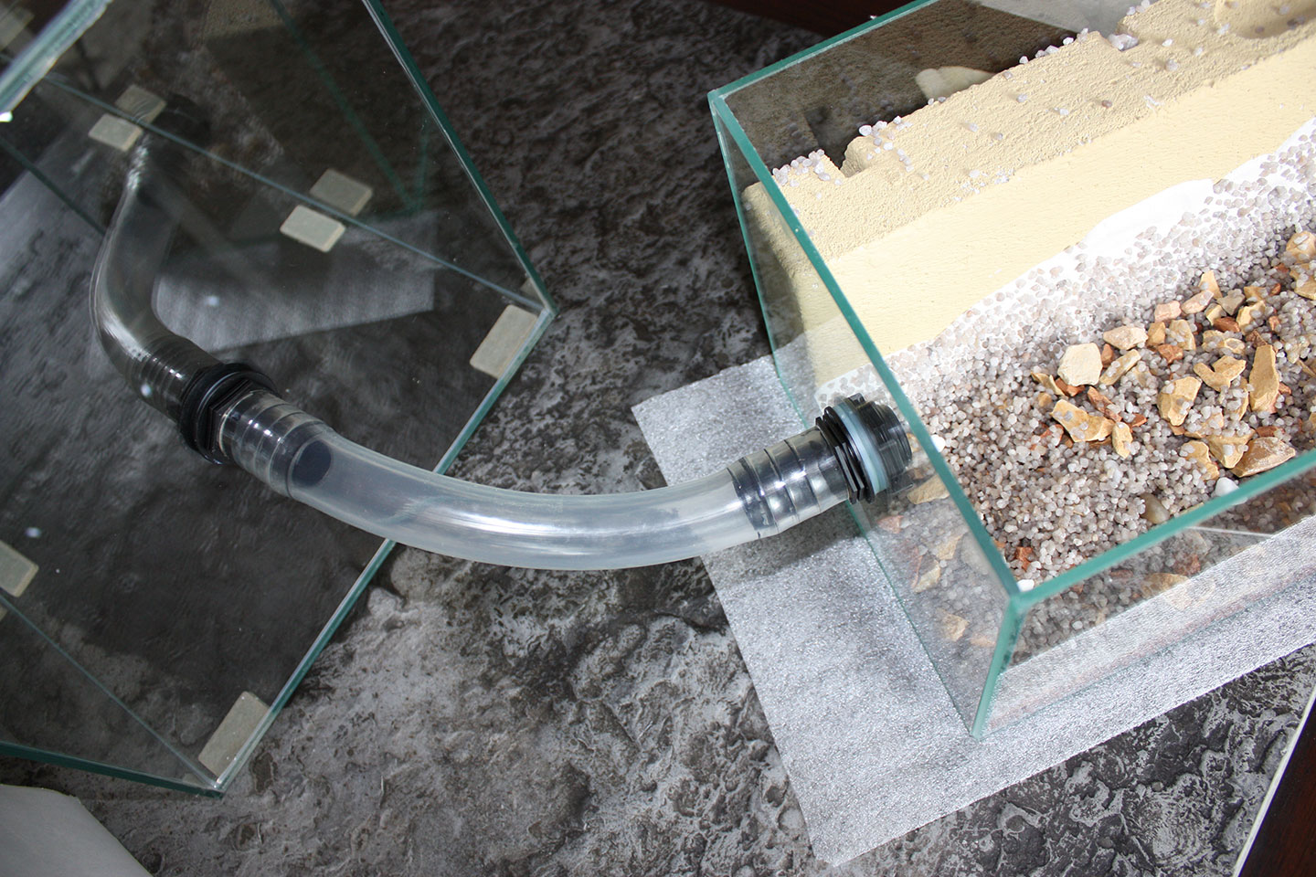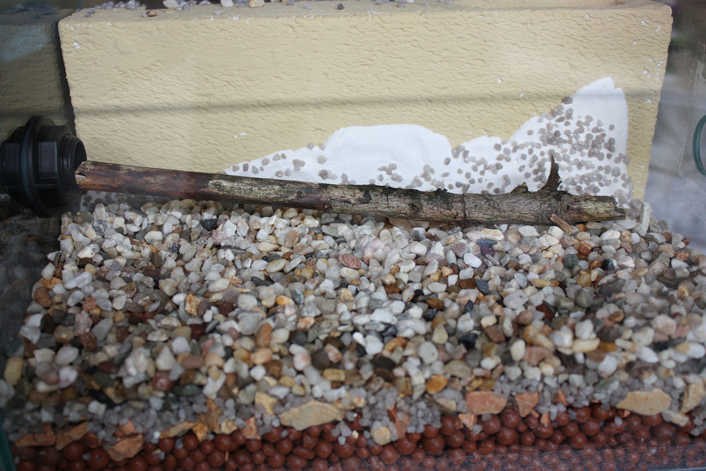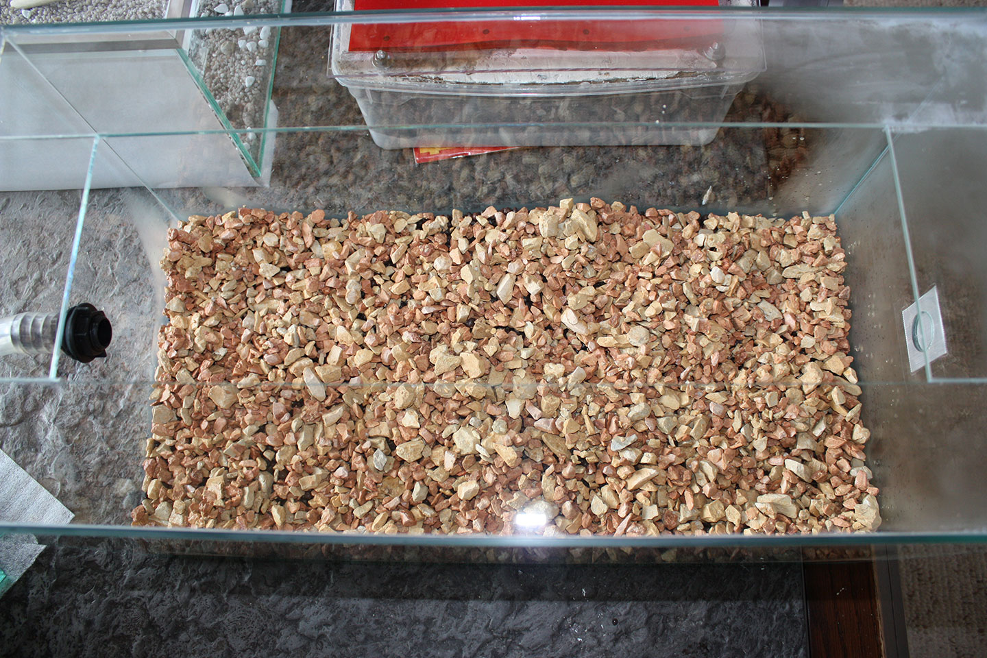 Anschließend kommt der Grobe Kies in das Glasbecken um den Feinen Kies vor Grabarbeiten zu schützen.