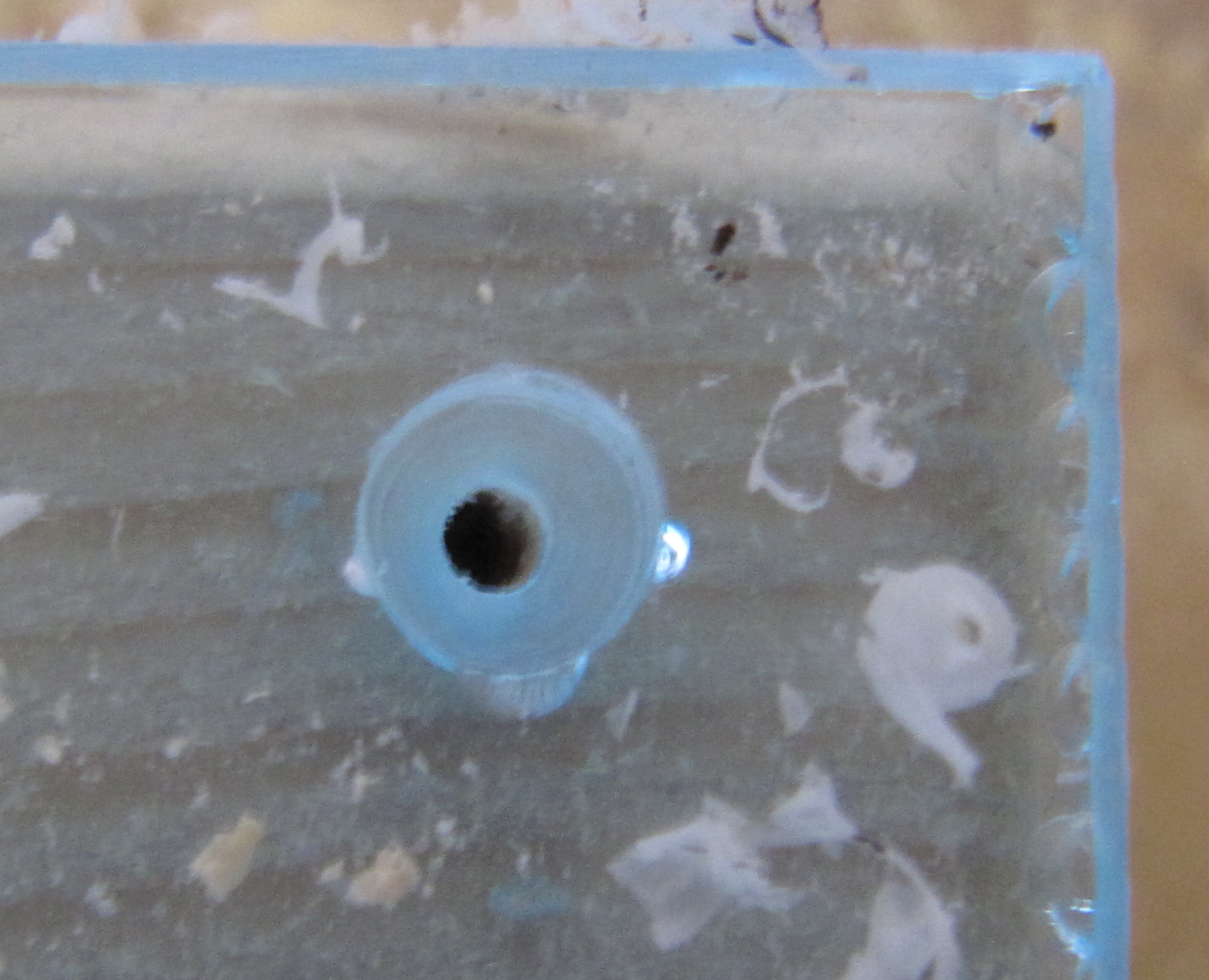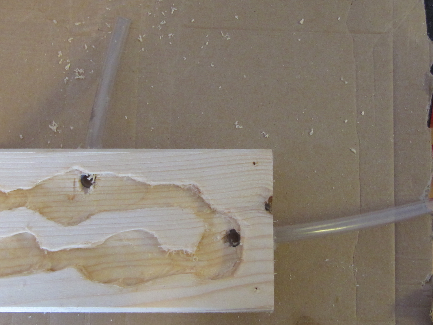 Ins Holz kommen jetzt noch zwei 10 mm Bohrungen: Eine erste für den Nesteingang und eine Zweite für den Wassertank (Reagenzglas mit Wasser hinter der Watte - garantiert eine gewisse Feuchtigkeit ohne dass man das Holznest direkt befeuchten/bewässern muss) oder für allfällige Nesterweiterungen. Die mit etwas Aquarien-Silikon bestrichenen Schläuche mit 10 mm Aussendurchmesser können leicht in die Bohrlöcher eingeführt werden. Selbstverständlich muss man alles trocknen lassen, bevor die Ameisen einziehen können.