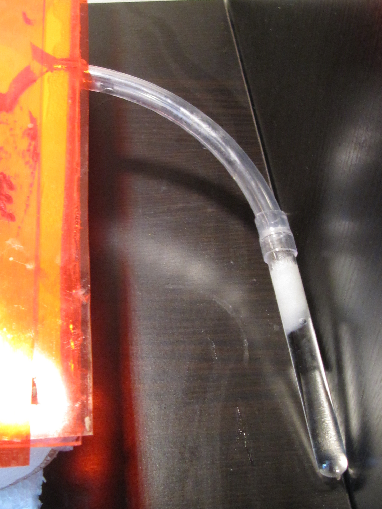 Ins Holz kommen jetzt noch zwei 10 mm Bohrungen: Eine erste für den Nesteingang und eine Zweite für den Wassertank (Reagenzglas mit Wasser hinter der Watte - garantiert eine gewisse Feuchtigkeit ohne dass man das Holznest direkt befeuchten/bewässern muss) oder für allfällige Nesterweiterungen. Die mit etwas Aquarien-Silikon bestrichenen Schläuche mit 10 mm Aussendurchmesser können leicht in die Bohrlöcher eingeführt werden. Selbstverständlich muss man alles trocknen lassen, bevor die Ameisen einziehen können.