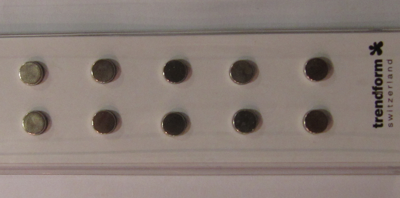 Das Prinzip ist einfach: Man besorgt sich mindestens zwei kleine, starke Magnete (meine haben einen Durchmesser von 5mm und sind 3mm hoch) und versieht mindestens einen davon mit einem Filz-Stückchen. Befestigt wird dieses mit Aquariensilikon. Den Selbstkleber auf den Filzstückchen, die etwa als Untersätze für Möbel angeboten werden, schneide ich weg.