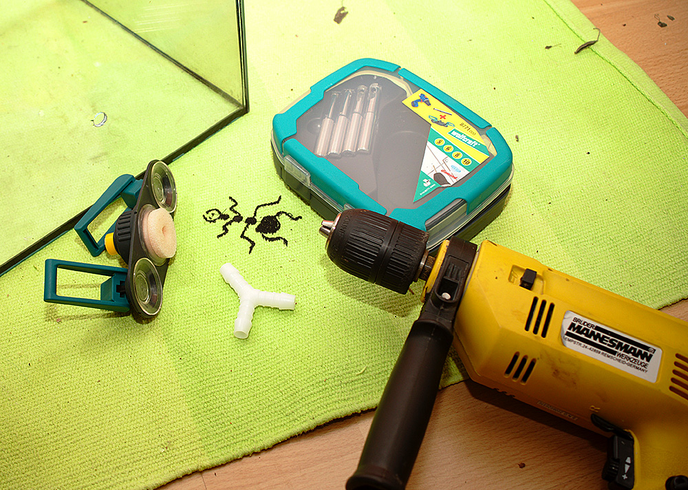 ich bin gerade dabei das Formicarium meiner Camponotus ligniperdus für die neue Saison vorzubereiten. Da ich wegen der Koloniegröße nun ein Außennest nutzen will, musste ich ein Loch für den Schlauchanschluss in das Becken bohren. Ein Freund hat mir sein Glasbohrer Set "Wolfcraft 8771000" gegeben, das zwar laut Kundenbewertungen im Internet nicht so gut sein soll aber eigentlich doch sehr gut funktioniert hat. Das praktische bei dem Set ist die Führung, in die man auch einen beiliegenden Schwamm zur Kühlung des Glases und Bohrers einbringen kann. Nachdem die Führung samt nassen Schwamm mit den Saugnäpfen am Becken angebracht war, hab ich mit meiner Bohrmaschine (OHNE Schlag!!) auf niedrigster Stufe ca. 10 Minuten mit kurzen Pausen dazwischen gebohrt. Leider hatte ich wohl am Ende noch einen Tick zu viel Druck drauf, sodass noch ein Stück der Oberfläche mit herausgebrochen ist. Ist aber nur ein kosmetisches Problem. Danach habe ich die Glaskante noch mit Schleifpapier etwas entgratet und den Schlauchanschluss mit etwas Gewalt reingedreht. Hält wunderbar, kann das Set nur weiterempfehlen! Wie viele Bohrungen ein Bohrkopf durchhält, weiß ich leider nicht. Das müsste jetzt die zweite oder dritte Benutzung gewesen sein.