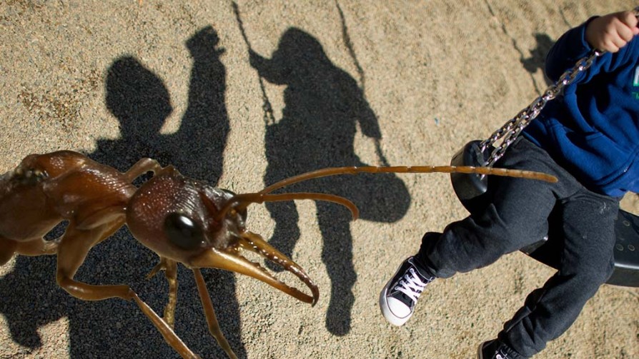 Tja, da muss man doch wirklich etwas unternehmen, wenn die riesigen, stechwütigen eingeschleppten Myrmecia den Kindern so bedrohlich nahe kommen, wie es das Bild in der Zeitung suggeriert.