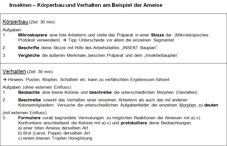 Die Aufgaben beschränken sich auf "Körperbau" und "Verhaltensbeobachtungen", da pro Gruppe nur 30 Minuten zur Verfügung standen.