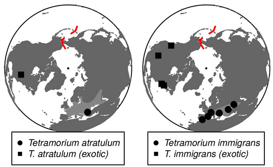 Das sind Myrmica rubra, Tetramorium atratulum („früher“ bekannt als Anergates atratulus, arbeiterinloser Sozialparasit bei Tetramorium spp.), und Tetramorium immigrans. Auch Lasius niger ist in N-Amerika „exotic“, wobei andere dort als L. niger identifizierte Tiere als „not La. niger“ entlarvt wurden.