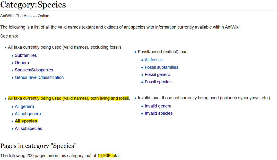 So to calculate the exact number of valid and extant species, we can now either subtract the supspecies category (4.) from the species/supspecies category (1.), which would make 14,135 valid and extant species (15,940-1,805), or subtract the fossil species category (3.) from the species category (2.), which would make 14,074 valid and extant species (14,938-864). In theory, both numbers should be the same but antwiki isn't completely up to date and for example some some taxa listed in the supspecies category are now species. Another factor contributing to the difference is that some species have (accidently?) only been added to the extant species/subspecies category (1.) and not to the species category (2.).