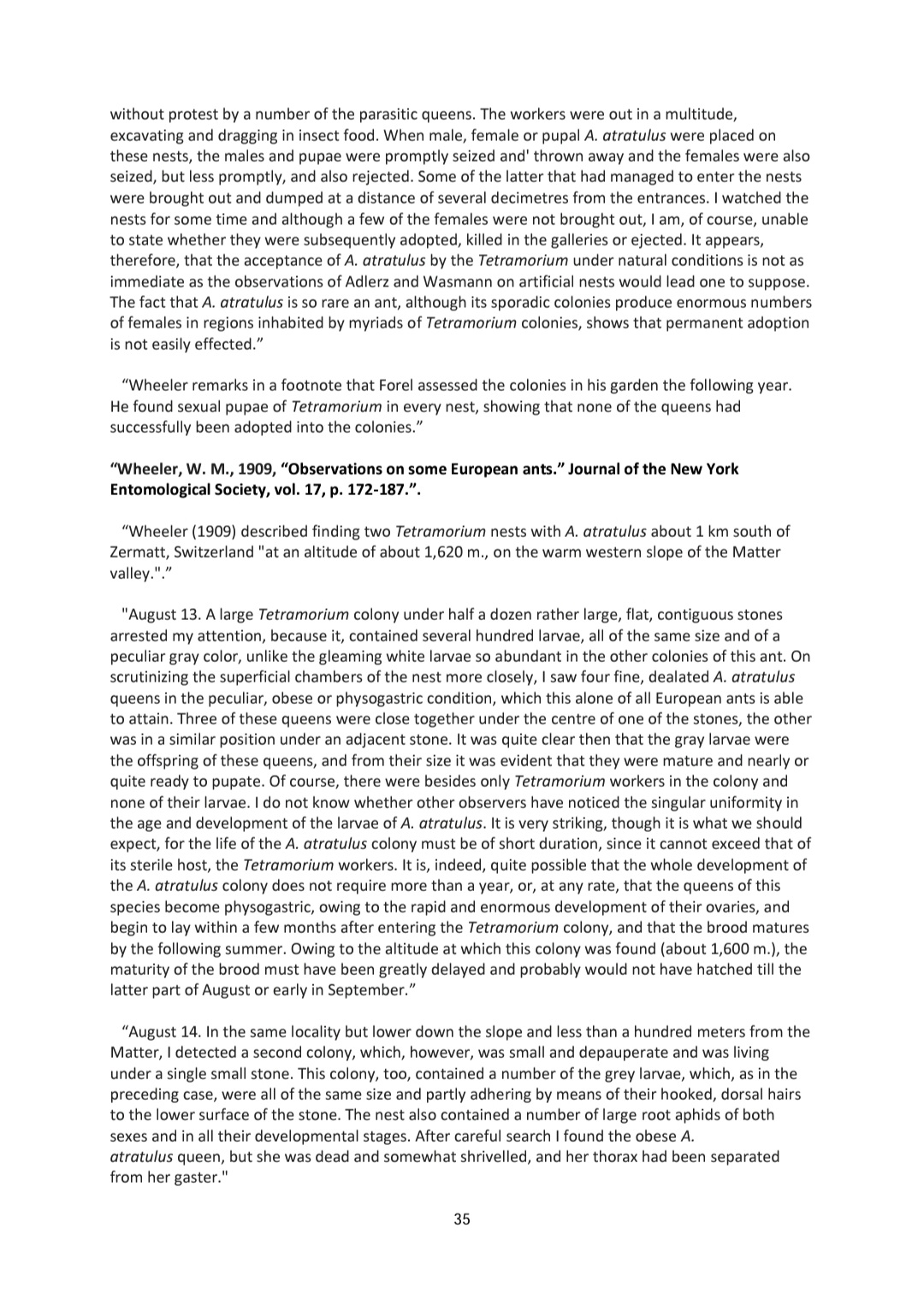 Schär, S., 2022 found the species again after 71 years in Saas-Fee. But there was a problem, nl. the spacies was found “... unter einem kleinen Stein in alpinem Rasen beim Triftbach nahe Saas-Fee” in “ein Tetramorium-Ameisennest. Der genaue Fundort liegt bei 46.10962ºN, 7.90897ºE, 2185 m ü. M. Das Nest mit dunkel gefärbten Tieren befand sich unter einem Stein von ca. 20 cm Durchmesser....” and “..., ist der neue Fundort mindestens 500 m vom Waldgebiet entfernt, welches von Stumper (1951) als Fundgebiet der drei zwischen 1949 und 1950 entdeckten Kolonien beschrieben wurde. Die neue Fundstelle liegt ausserdem auf alpinem Rasen und nicht in lichtem Lärchen-Arvenwald. Dies zeigt, dass Tet. inquilinum bei Saas-Fee bezüglich Habitatwahl flexibler ist, als man aufgrund der historischen Funde hätte vermuten können. Ausserdem sind alpine Rasen wohl weniger durch menschliche Aktivitäten bedroht als lichte Nadelwälder, was für den Fortbestand von Tet. inquilinum hilfreich sein könnte. Der menschliche Eingriff im Fundgebiet scheint sich auf leichte Beweidung durch Schwarznasenschafe zu beschränken, welche diese Ameisenpopulationen kaum zu beeinflussen vermögen. ”. And further that the species “... hier aber immerhin unterschiedliche Habitate besiedelt, nämlich lichte Nadelwälder und alpine Rasen.”.