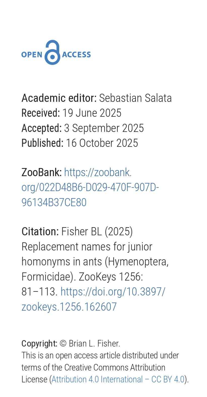Neue Namen für teils altbekannte Ameisenarten: Replacement names for junior homonyms in ants (Hymenoptera, Formicidae). Brian L. Fisher, 2025.