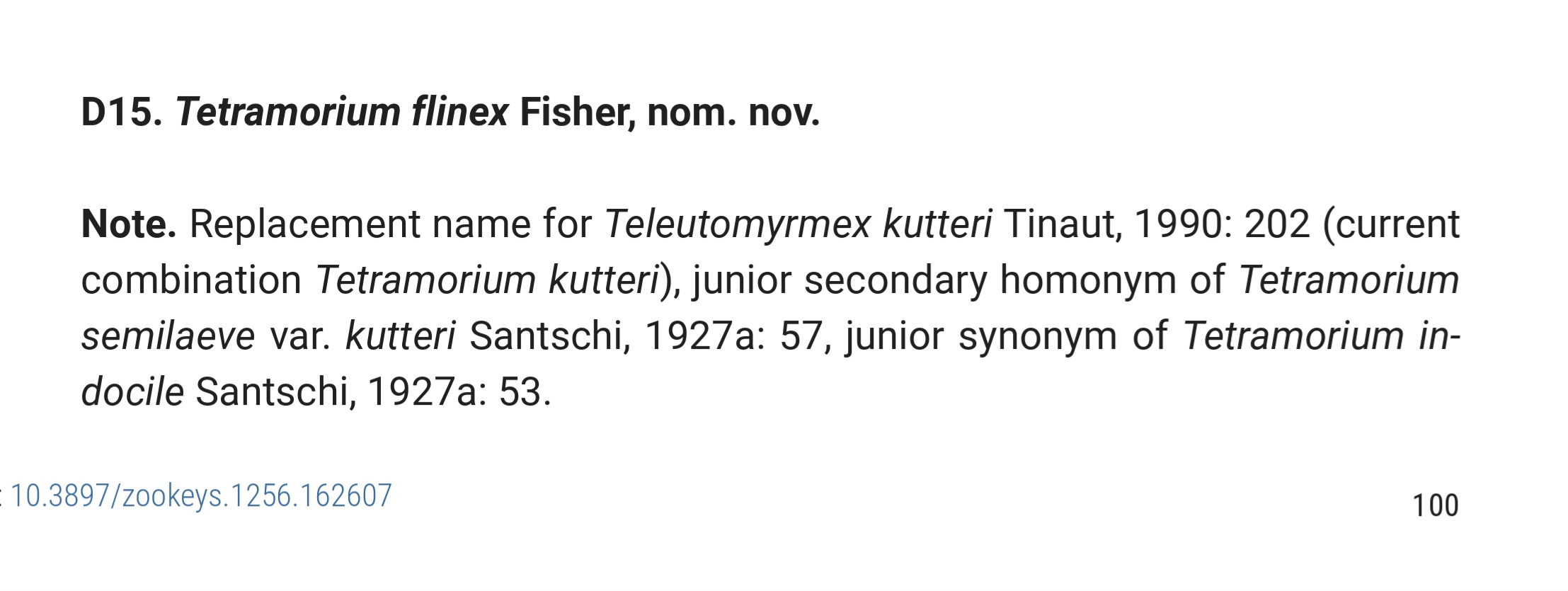 The next page includes a reprint of a manuscript that was rejected by the journals “Systematic Entomology.”, “Insectes Sociaux.” (and related journals of Springer Link.), “Revue Suisse de Zoologie.” and “Myrmecological News.” and from co-authorship by Prof. Em. A. Buschinger and Prof. Em. B. Seifert. So, for completeness, it is included in full here. It was written in the beginning of December 2022. Teleutomyrmex kutteri Tinaut, 1990 is now named Tetramorium flinex Fisher, 2025.