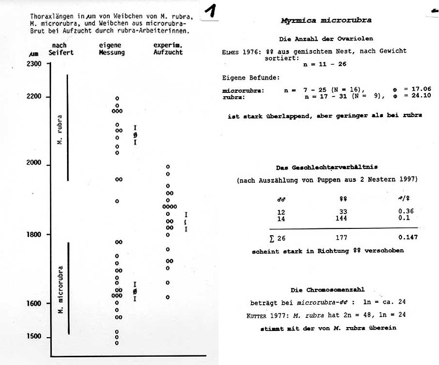 Denkbar ist aber auch dass die Mikrogynen genetische Linien sind, welche sich immer wieder von M. rubra abspalten. Dies würde dann eher auf ein frühes Stadium der Artbildung hinweisen was ich persönlich nicht weniger spannend fände.Demgegenüber erstaunt besonders das Verbreitungsbild von M. microrubra im Vergleich zu anderen, sicheren Inquilinen. Solche finden sich nach allen Erfahrungen des Verfassers fast immer nur in Bereichen mit genügend hoher Populationsdichte ihrer Wirtsart. Dazwischenliegende Populationen der Selbständigen Art mit geringerer Dichte sind frei von den Parasiten….