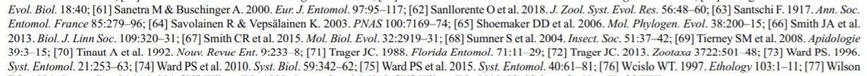 Baur, A., Sanetra, M., Chalwatzis, N., Buschinger, A., Zimmermann, F. K., 1996, “Sequence comparisons of the internal transcribed spacer region of ribosomal genes support close relationships between parasitic ants and their respective host species (Hymenoptera: Formicidae).” Insectes Sociaux, vol. 43, p. 53-67.
