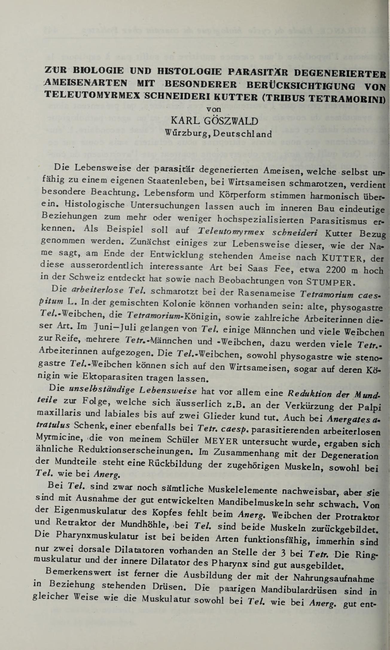 Stumper, R., 1951, “Teleutomyrmex schneideri Kutter (Hym. Formicid.). II. Mitteilung. Über die Lebensweise der neuen Schmarotzerameise.” Mitteilungen der Schweizerischen Entomologischen Gessellschaft, vol. 24, no. 2, p. 129-152.