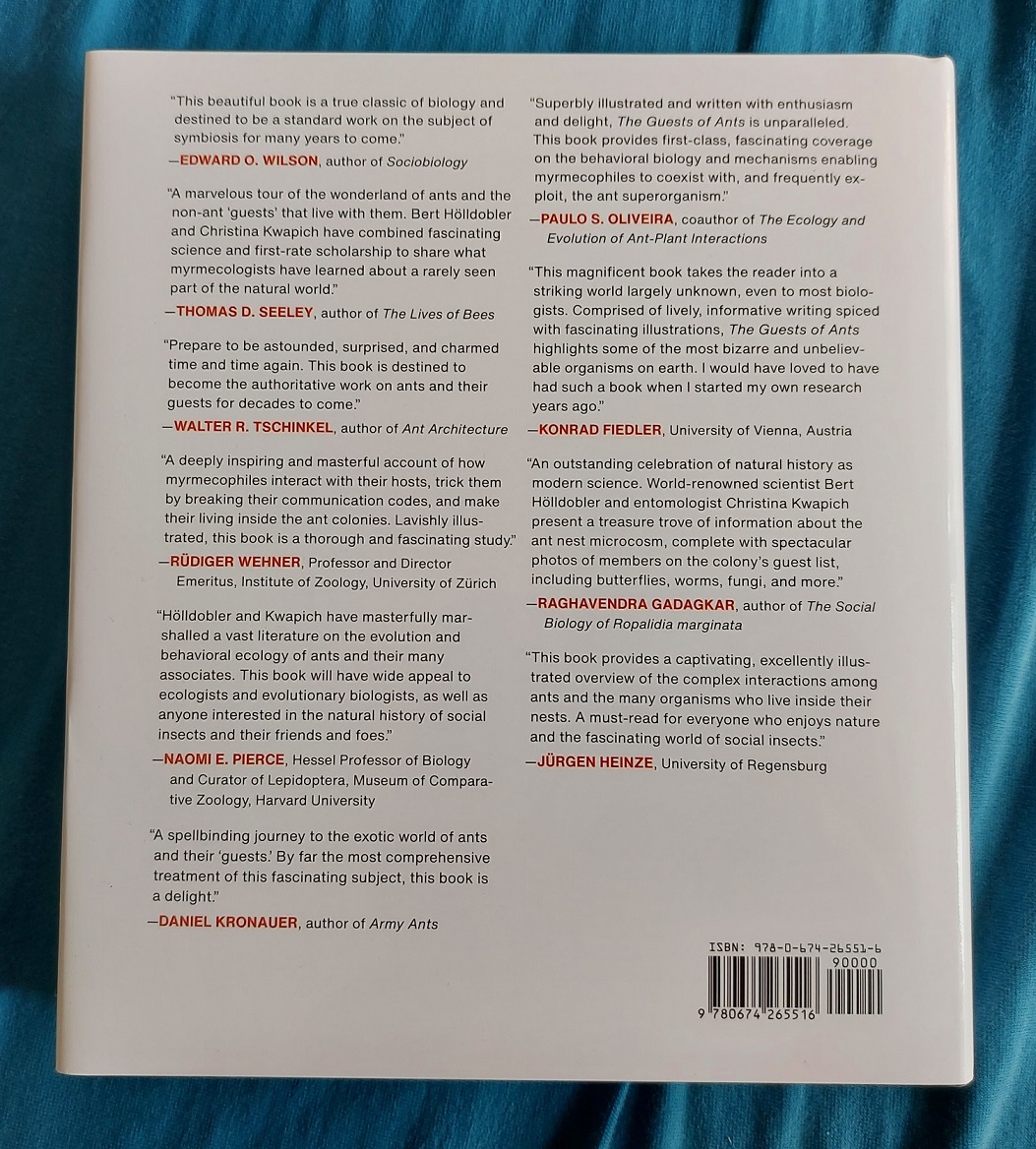 Mein Kommentar: Es geht also vor allem um Ameisengäste, mit denen sich Hölldobler immer wieder intensiv befasst hat. Mich wundert jedoch, dass in dem Buch der Begriff „socially parasitic“ auch auf individualparasitische Organismen wie Pilze und Bakterien ausgeweitet wird, dass auch diese als "Myrmecophile" (Ameisengäste) bezeichnet werden, und dass ausgerechnet die sozialparasitischen Ameisen nicht enthalten sind. Sie sind doch gerade die Organismen, die davon leben, dass sie als Abkömmlinge ehemals selbständiger sozialer Vorfahren die sozialen Leistungen ihrer Wirte nutzen. Für sie wurde einst der Begriff „Sozialparasitismus“ geprägt. Irgendwie schade.