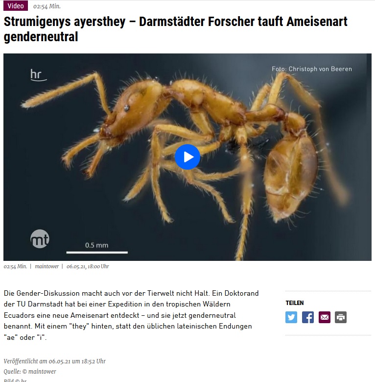 Ich hänge es trotzdem hier noch drunter:(Die 800 sex. Identitäten bedürfen wohl einer Deutung. - Anm. Merkur)Die Gender-Diskussion ist in aller Munde und macht auch vor den Darmstädter Biologen nicht halt. Eine neu entdeckte Ameisenspezies hat jetzt einen geschlechtsneutralen Namen bekommen.